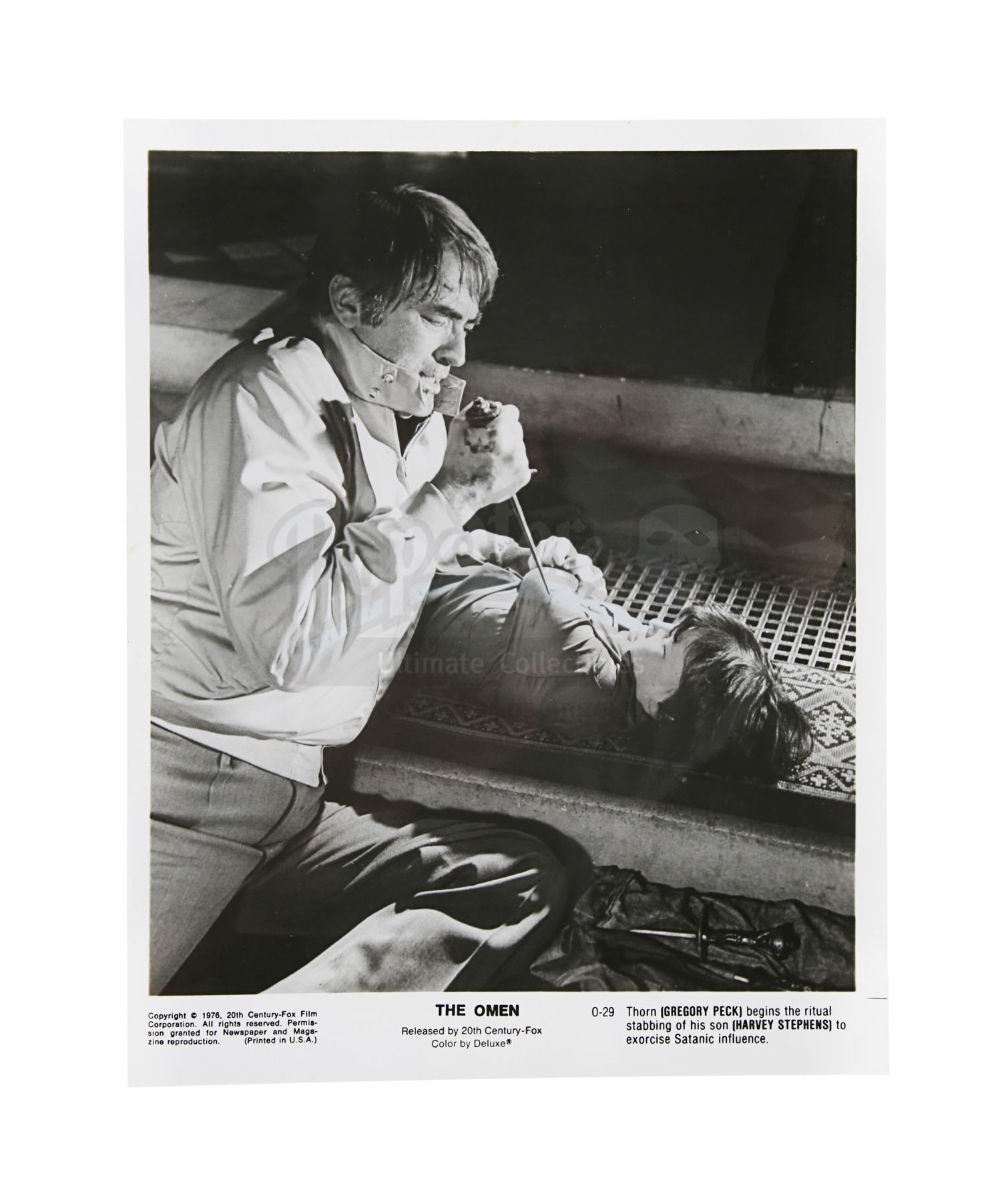 A hero Dagger of Megiddo from Richard Donner's horror The Omen. The sacred Seven Daggers of Megiddo were the only weapons that could be used to destroy the Antichrist Damien Thorn (Harvey Spencer Stephens). In the town of Megiddo, exorcist Carl Bugenhagen (Leo McKern) showed Robert Thorn (Gregory Peck) how the seven daggers should be arranged in a cross formation, and explained that the ritual had to be performed on hallowed ground. Originally obtained from actor Leo McKern, this dagger was one of 12 made for the production.