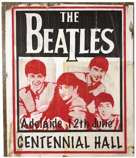 One-of-a-kind 52" x 61" hand-painted poster advertising The Beatles debut appearance in Australia on June 12, 1964. Thought to be the only known concert poster from any of the four cities in which The Beatles performed during their one and only visit to Australia, our own exhaustive research indicates no other posters, printed or hand-painted, were produced for the Australian concerts. Had it not been for the inclusion of Adelaide to the tour, many months after the original agreement between Melbourne promoter Kenn Brodziak and Beatles manager Brian Epstein was being negotiated to bring The Beatles to Australia, this lone surviving artifact would never have been produced.