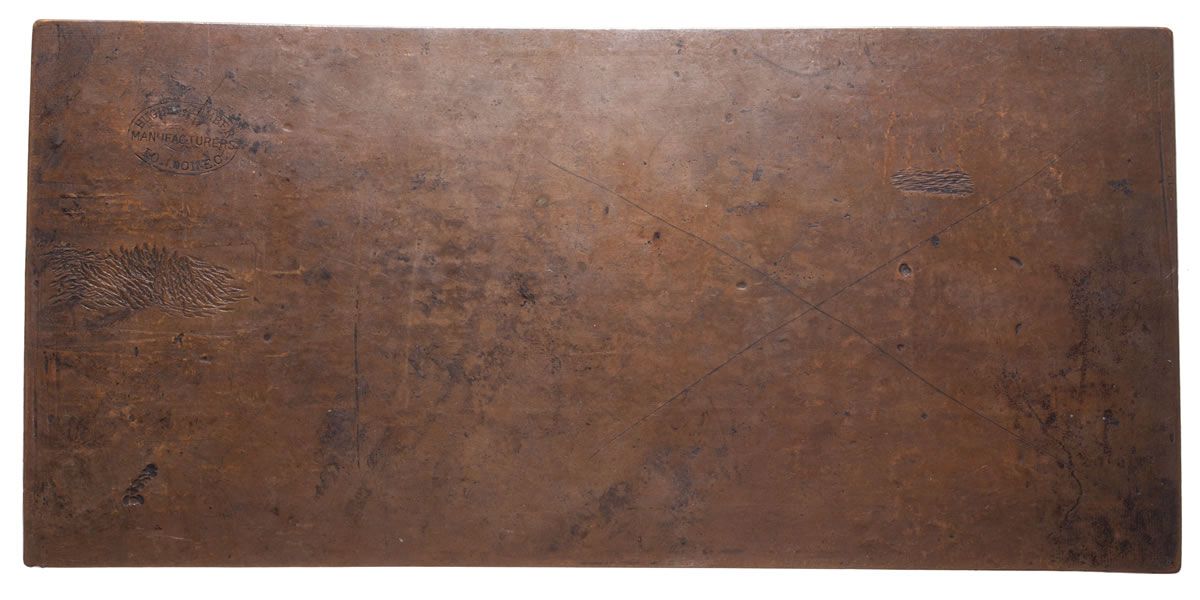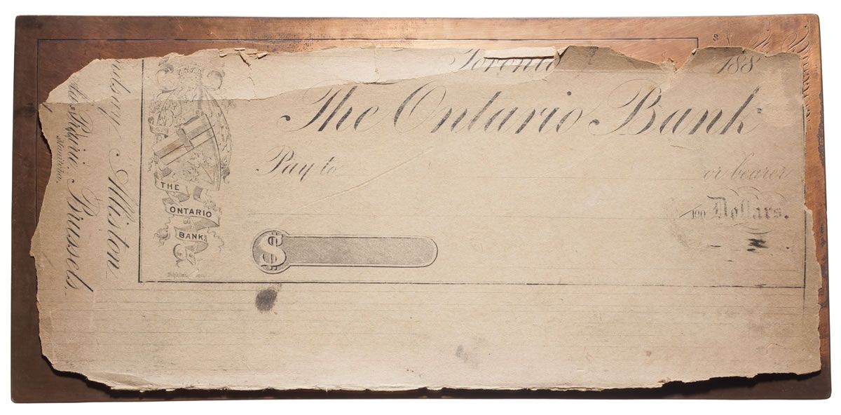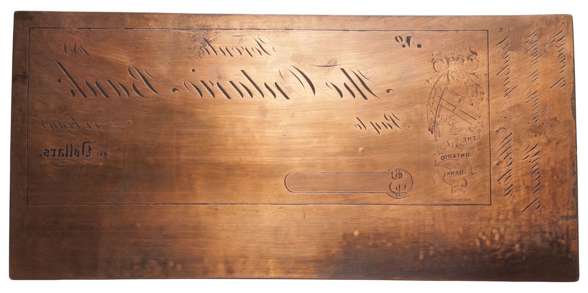 188_. A mirror image copper printing plate for cheques. "The Ontario Bank, Toronto" in bold script at top. Coat of arms at left. Wide left margin with "Lindsay, Alliston, Portage la Prairie, Brussels" in cursive script. Red-brown patina. Measures 4.5" x 9.5". Believed to be unique.