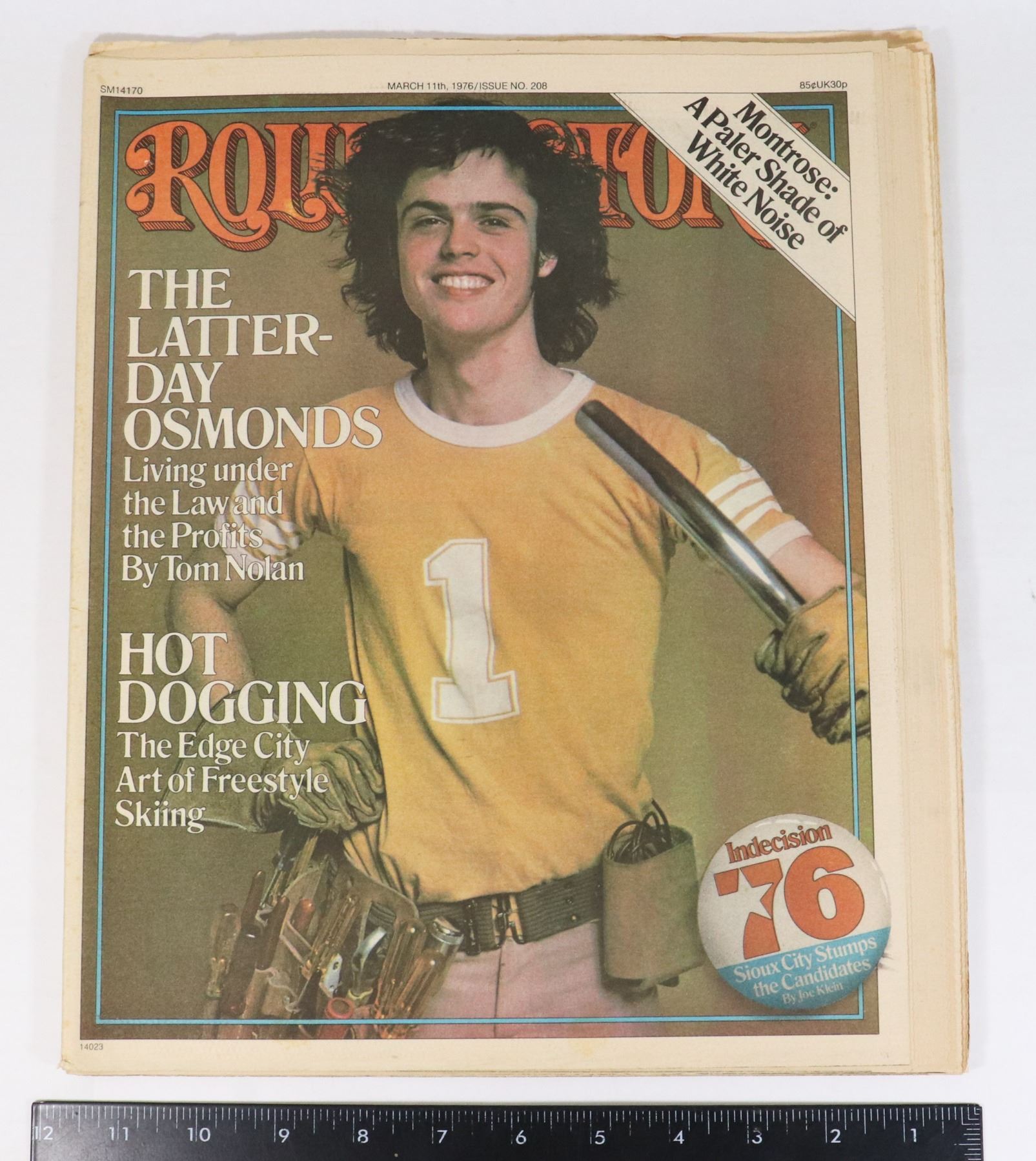 RARE ORIGINAL ROLLING STONE MAGAZINE ISSUED MARCH 11, 1976. THE MAGAZINE HAS A GREAT MULTIPAGE ARTICLE ON THE OSMONDS & THE NEW SINGLES BY ROXY MUSIC (LOVE IS THE DRUG) AND QUEEN (BOHEMIAN RHAPSODY).