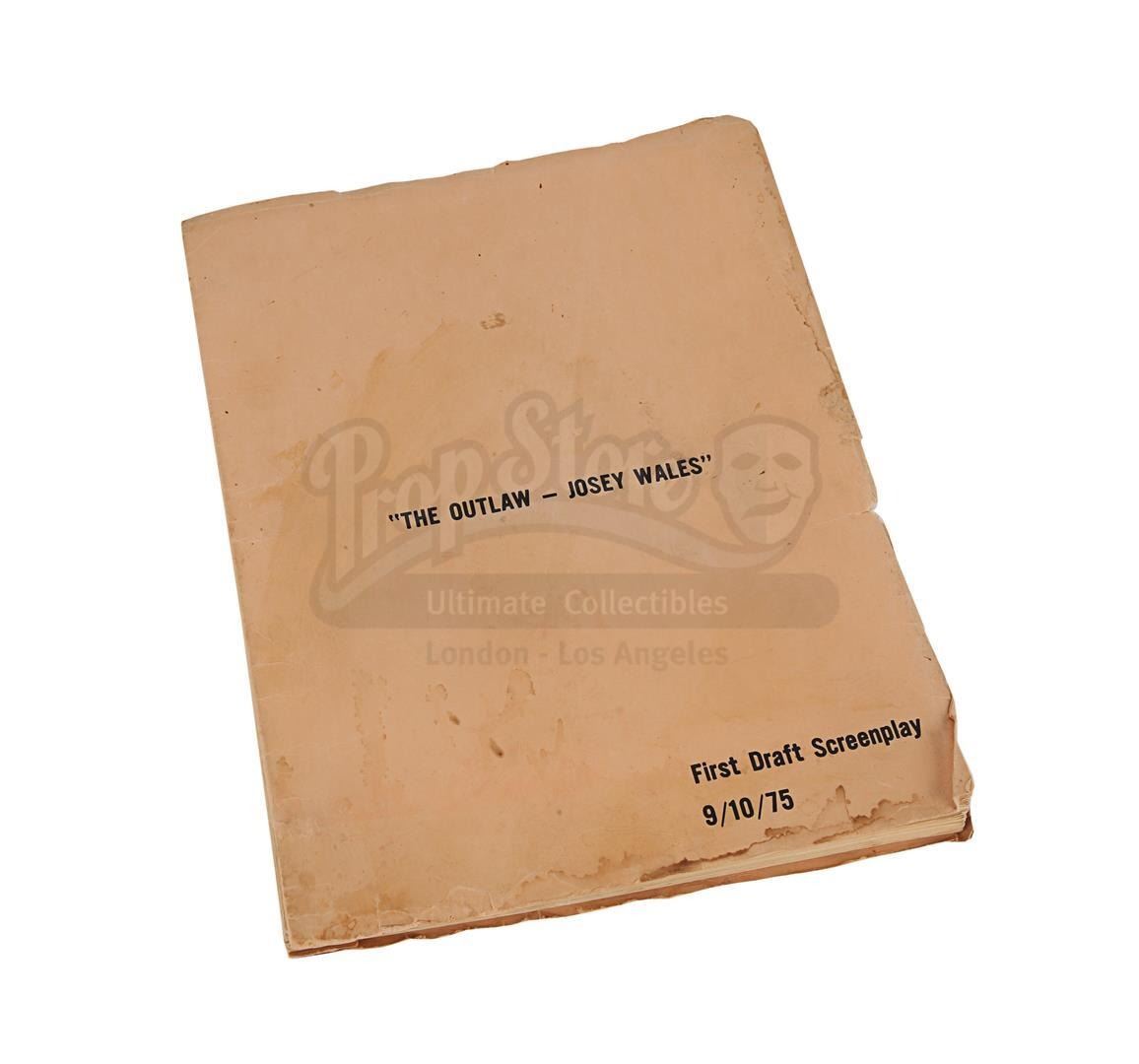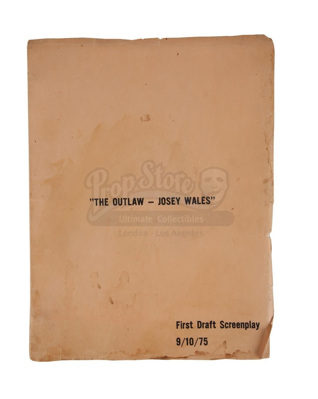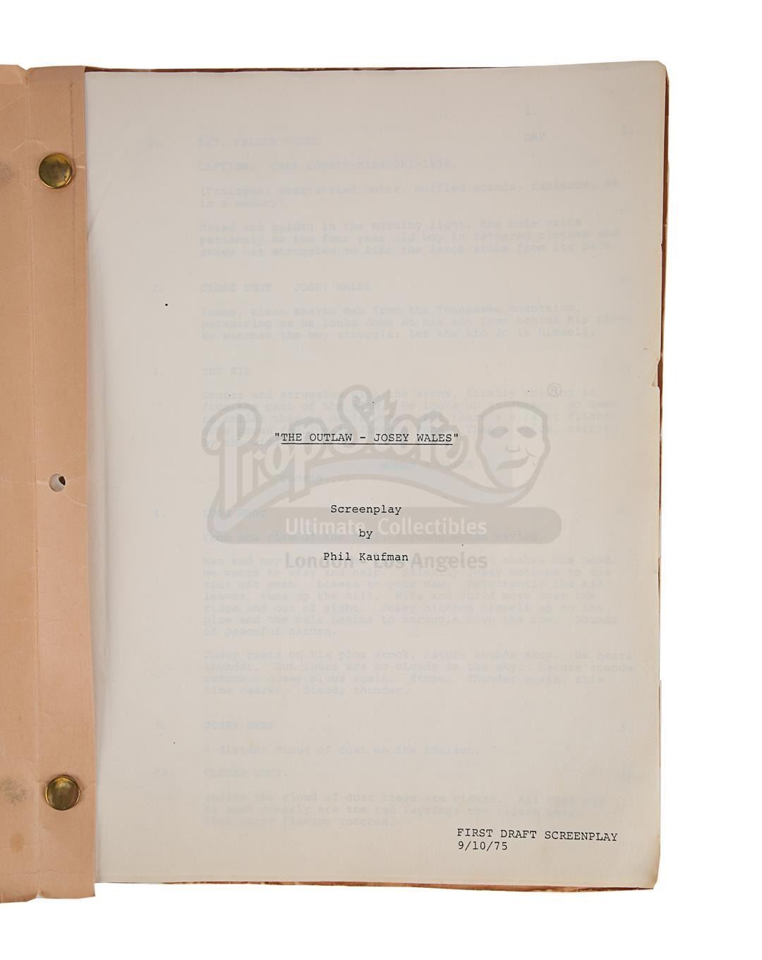 A first draft script from the production of Clint Eastwood's Western The Outlaw Josey Wales. The document is bound within a brown card cover, which features the production title and draft date "9/10/75". Credited to Philip Kaufman, this screenplay comprises 111 US Letter pages printed single-sided on white paper. The inside pages of the lot display minor creasing and slight discolouration from production use. There are notable signs of wear on the card cover, including small rips, marks and water damage. Dimensions: 29 cm x 22 cm x 1.5 cm (11 1/2" x 8 3/4" x 1/2")