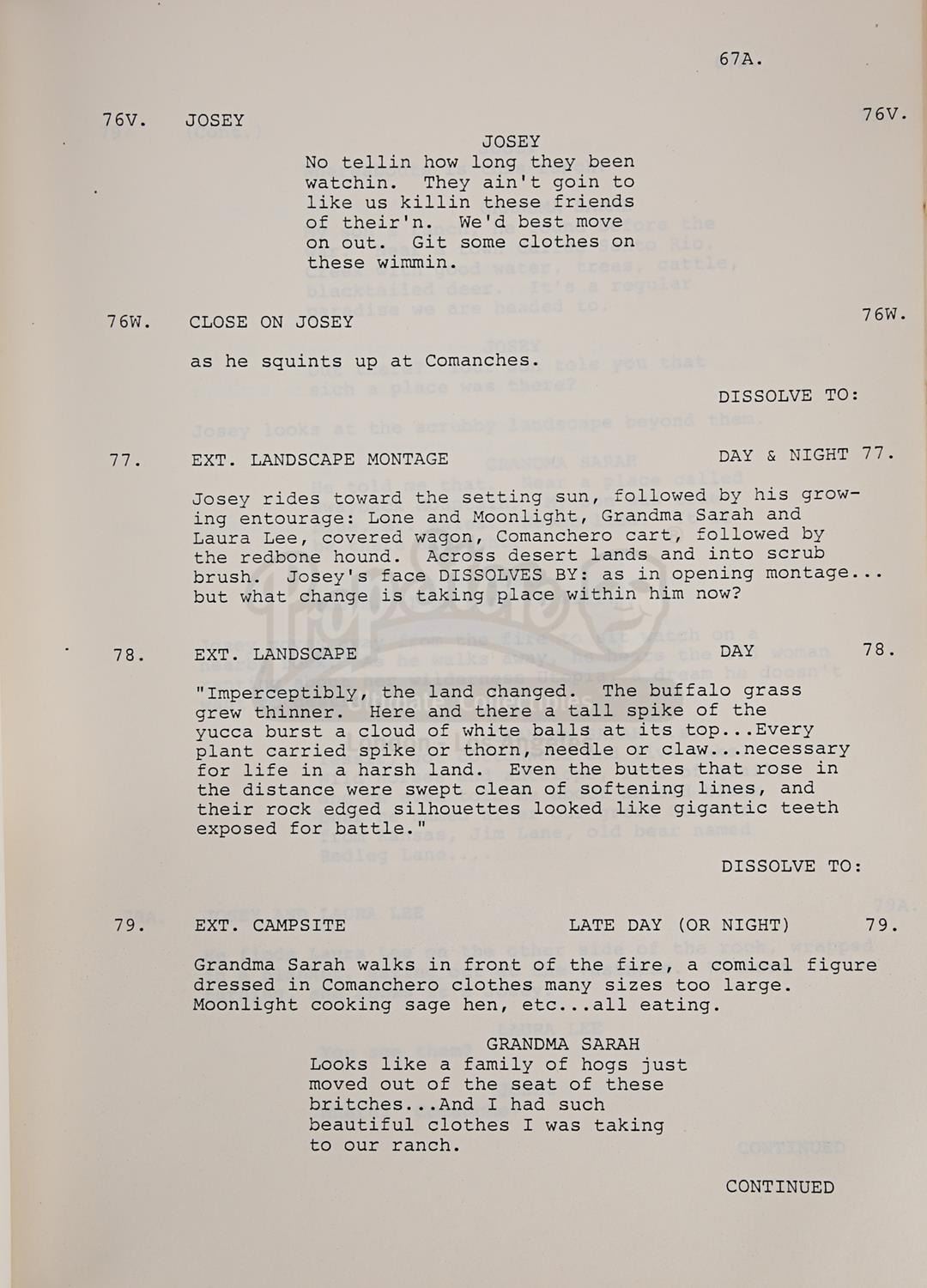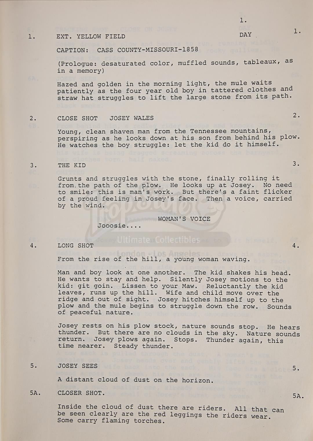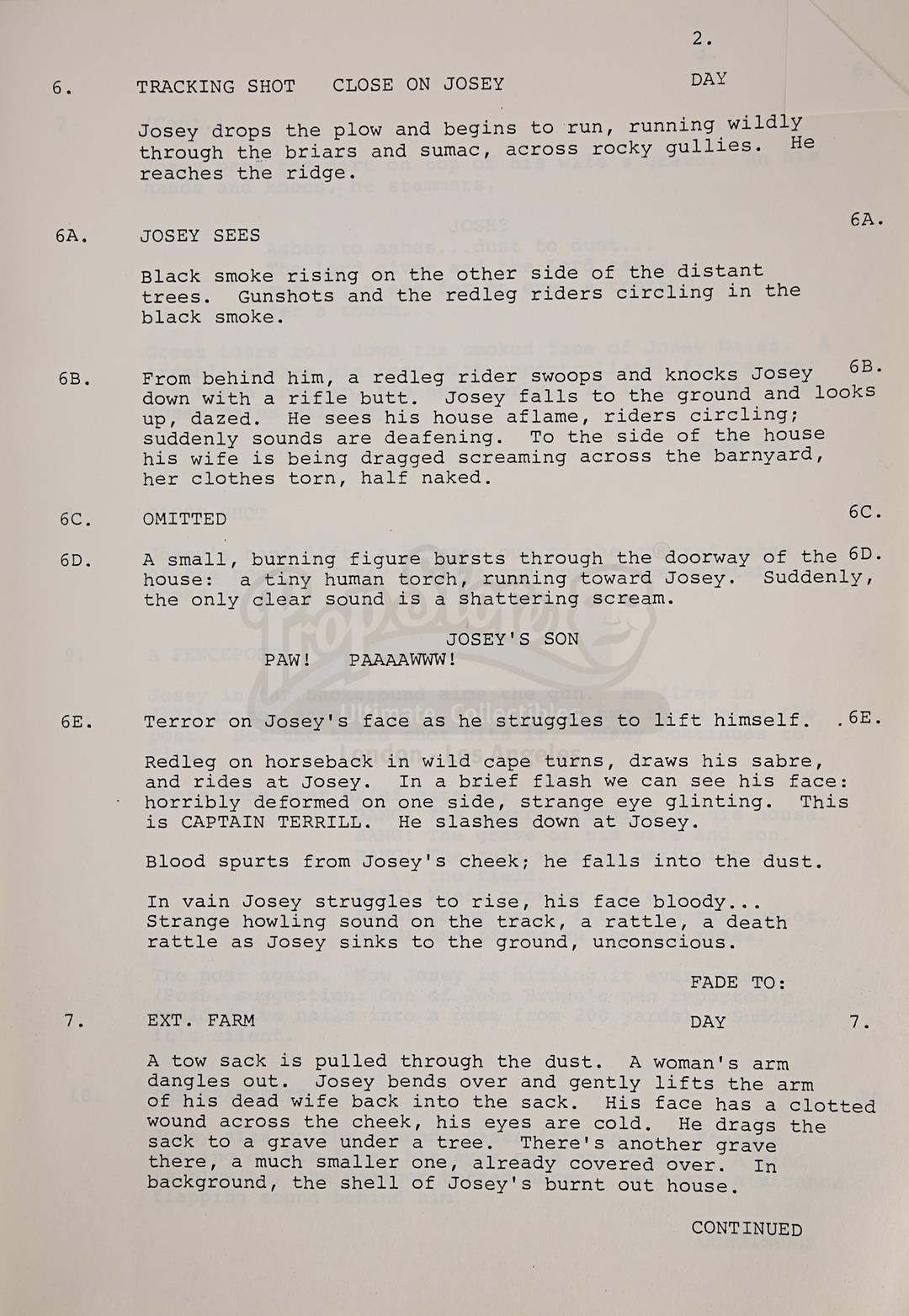 A first draft script from the production of Clint Eastwood's Western The Outlaw Josey Wales. The document is bound within a brown card cover, which features the production title and draft date "9/10/75". Credited to Philip Kaufman, this screenplay comprises 111 US Letter pages printed single-sided on white paper. The inside pages of the lot display minor creasing and slight discolouration from production use. There are notable signs of wear on the card cover, including small rips, marks and water damage. Dimensions: 29 cm x 22 cm x 1.5 cm (11 1/2" x 8 3/4" x 1/2")