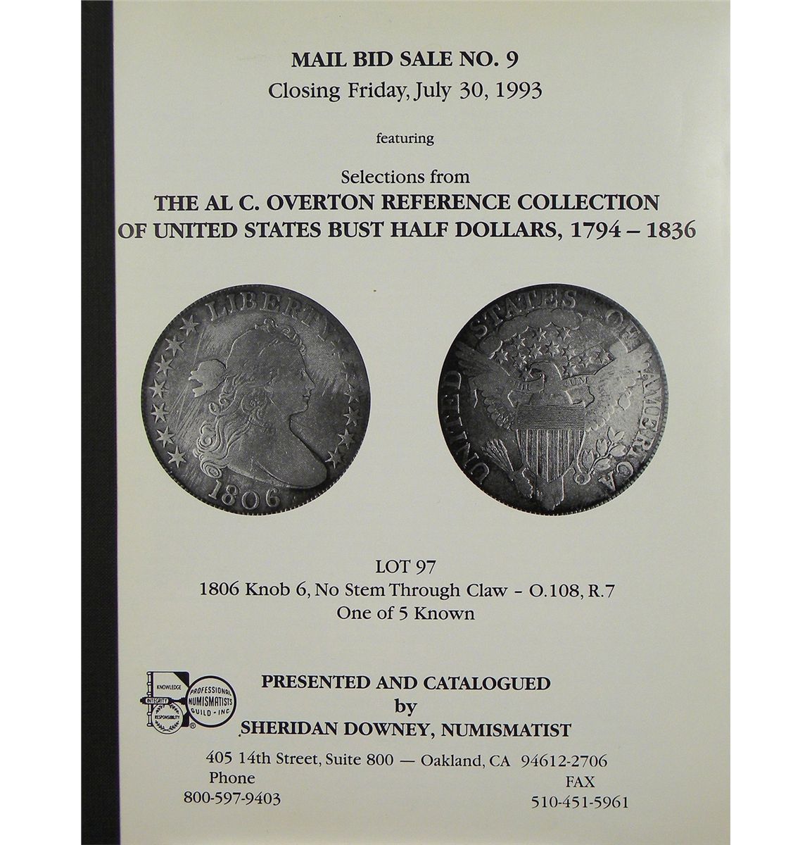 Downey, Sheridan. MAIL BID SALE NO. 9. FEATURING SELECTIONS FROM THE AL C. OVERTON REFERENCE COLLECTION OF UNITED STATES BUST HALF DOLLARS, 1794–1836. Oakland, July 30, 1993. 4to, original black cloth-backed pictorial card covers. (4), iii, 51, (4) pages including 5 plates of half dollars; 394 lots. Near fine. Of considerable importance. Described in the catalogue as “the most exciting sale of Bust Half Dollars in the history of numismatics,” the Overton collection sale never took place, as the collection was sold shortly before the mail-bid sale was to be held. Accounting for the present scarcity of this catalogue, Downey has noted that, because of the deal, “I stopped the press run of the catalogue at 400 copies.”