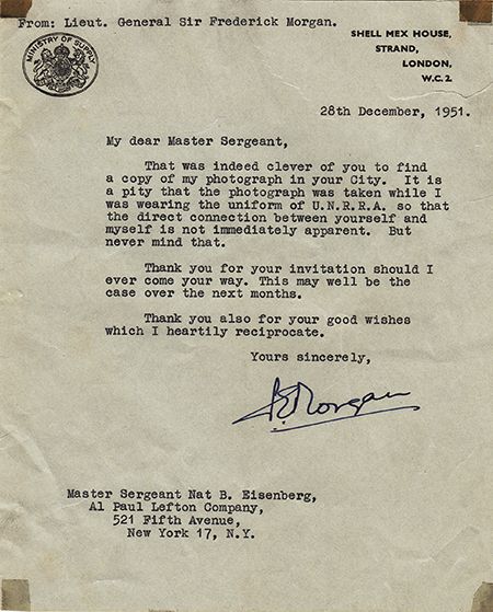 FREDERICK E. MORGAN (1894 - 1967) British Army officer, Chief of Staff to the Supreme Allied Commander (COSSAC), and the original planner of Operation Overlord (the Allied assault on Normandy on D-Day and thereafter). Scarce T.L.S. on Ministry of Supply letterhead, 1p. 8vo., London, Dec. 28, 1951 stating that it was clever for his correspondent to have found a picture of him in New York, but unfortunate that he was wearing a U.N.R.R.A. uniform. Tape stains in extreme corners, trimmed, else very good.