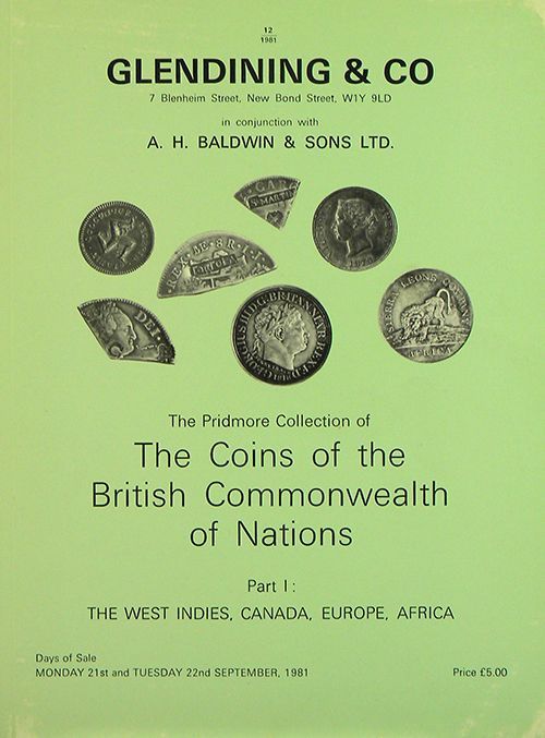 Glendining & Co. THE PRIDMORE COLLECTION OF THE COINS OF THE BRITISH COMMONWEALTH OF NATIONS. PART I: THE WEST INDIES, CANADA, EUROPE, AFRICA. London, 21-22 September 1981. 8vo, original printed card covers. 89, (7) pages; 776 lots; 25 plates. Estimate sheet laid in. Near fine. Important.