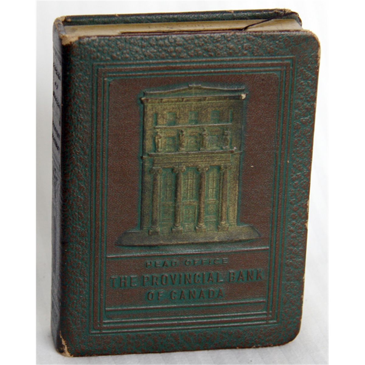 THE PROVINCIAL BANK OF CANADA. HEAD OFFICE. Coin slot on top. Key lock, with key present. Serial number 1024. 8cm x 11cm x 2cm. Dark green cloth or leatherette cover, with impressed image of bank building. Maker-Bankers Utilities, San Francisco, USA. No patent information. VF.