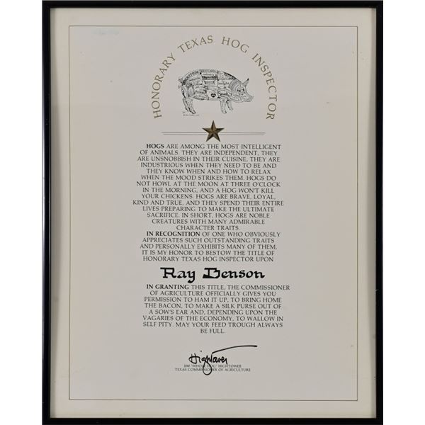 Signed By Jim Hightower, Texas Commissioner Of Agriculture and Presented to Ray Benson. Framed 16 1/2" X 20 1/2". From Ray Benson's pe...