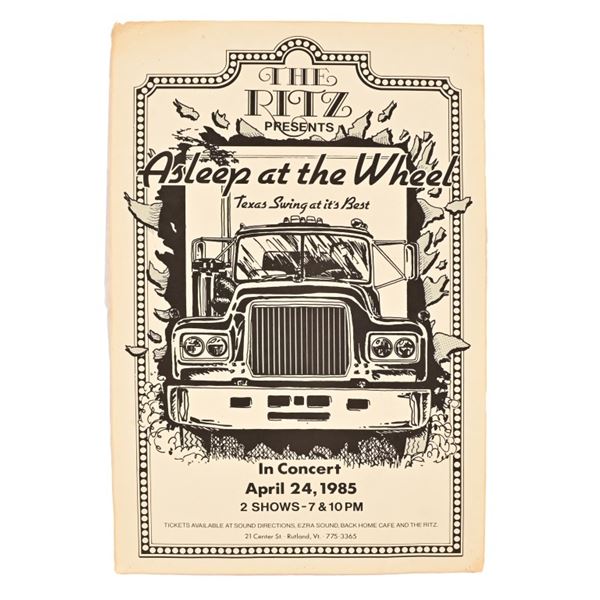The Ritz Presents Asleep At The Wheel, April 24, 1985. 2 Shows 7 & 10PM. 11" X 17" From Ray Benson's personal collection.