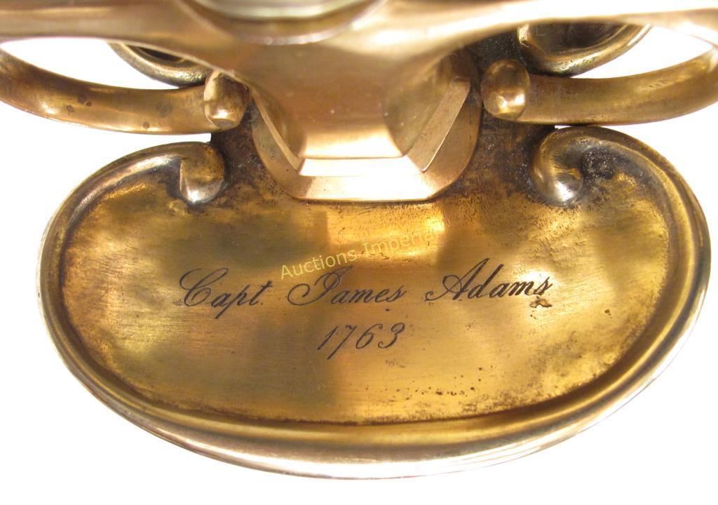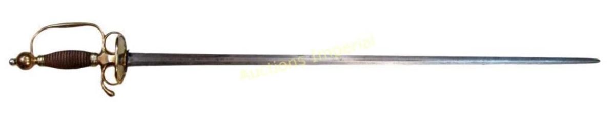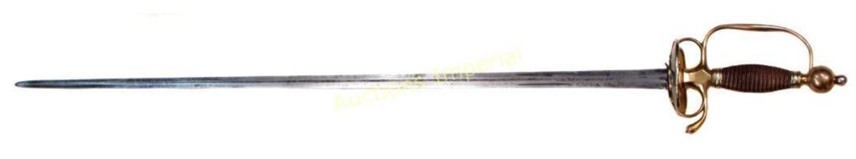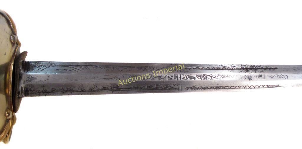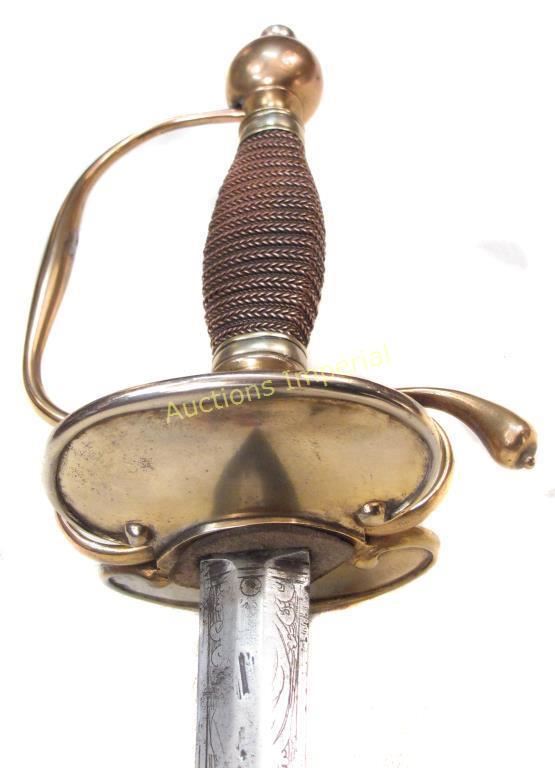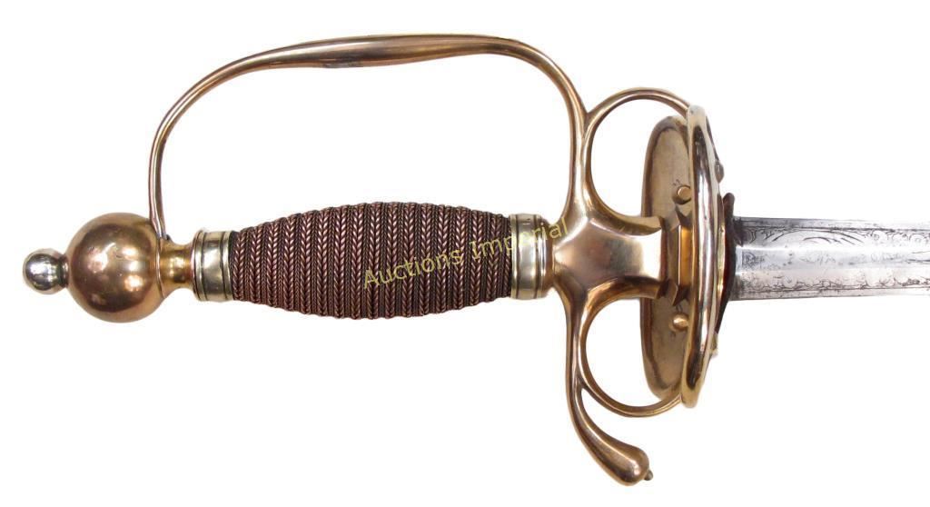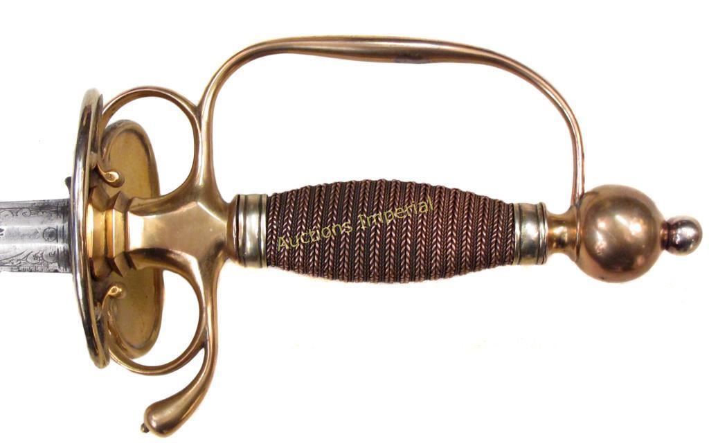 The hilt of gilded brass, displaying the staid elegance characteristic of the best Colonial American makers. With spherical pommel, and silver ferrules retaining the wooden grip with its original twisted copper wire wrap. The deep knucklebow, large rings with curled terminals and faceted quillon block all indicate the conservatism typical of Colonial work of the pre-Revolutionary period. The double-shell guard with raised rim terminating in curlicues, inscribed, CAPT. JAMES ADAMS 1763. The straight, double-edged blade of flattened hexagonal section, tapering continuously to the tip, with etched foliate panels at the forte. Edges retain considerable sharpness. Mid-18th century. Light wear, minor nicks. American colonist and patriot James Adams was born in Chester County, Pennsylvania on October 30, 1734; he would have been 29 or 30 when the sword was presented to him in 1763. In May of that year, Pontiac’s Uprising began, with mass attacks and killings among the Pennsylvania colonists by local Indians, in reaction to British policies following the French and Indian Wars. In October, 1763, John Penn was appointed Governor of Pennsylvania ; upon taking office, he immediately began raising a militia to protect the Pennsylvania Colony from the Indian attacks. James Adams was likely one of Penn’s recruits. According to the inscription, he achieved the rank of captain in that year, and may have received the sword in recognition by Penn himself, a likelihood well-supported by its quality of workmanship. Captain Adams would have been 41 years old at the signing of the Declaration of Independence on July 4, 1776. He is recorded in the Second Series of Pennsylvania Archives as well as the Minutes of the Committee of Safety as Captain of the Fourth Company of the Fifth Battalion of the Cumberland County Associators [Volunteers] of the Pennsylvania Militia. Glenn Adams, noted journalist and descendent of Captain Adams, records in a 2005 Associated Press article that Captain Adams was an active recruiter of volunteers, who “summoned his men from the harvest field.” In 1777, his unit acted as reinforcements to the Continental Army. He served in the Philadelphia area that year and in 1778 was sent to Bald Eagle, where he and the Fourth Company engaged the Indians, probably due to his combat experience with them 15 years earlier. The Journals of the Continental Congress record that Captain Adams was allocated 112 pounds 5 shillings to provide for his company’s march. The Miffin County Historical Society noted that Captain Adams played an important role in the Revolution. After a long and eventful life, Captain James Adams passed away in October, 1824, at age 89 or 90, the father of 13 children. We are indebted to Mr. Glenn Adams for his kind cooperation in the preceding research. His article may be accessed here: http://news.google.com/newspapers?nid=1876&dat=20050530&id=HzsfAAAAIBAJ&sjid=ZdAEAAAAIBAJ&pg=7038,5241399 Overall length 90 cm.