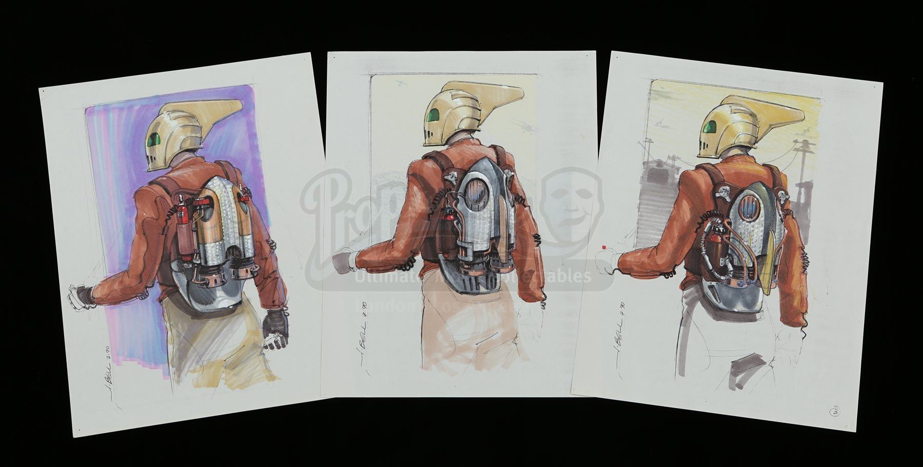 Each of these three pieces are rendered on paper with pencil, pen and pastel. While each piece is a printed copy, hand-drawn and hand-coloured modifications are present to provide different design concepts for the design of the Rocketeer’s Cirrus X3 rocket pack. The artist’s signature is handwritten at the bottom right corner and each piece is numbered at the bottom left corner. The lot shows minor signs of wear from use, including pinholes at the corners, and is in very fine overall condition. Dimensions (each): 28 cm x 21.5 cm (11” x 8 ½”)