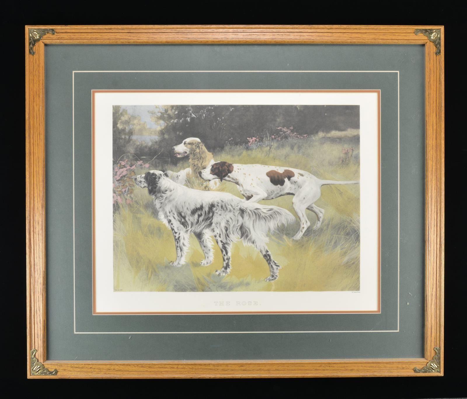 PRINT HAS NOT BEEN REMOVED FROM FRAME FOR INSPECTION. Approx. 27" x 20" print titled "The Rose" by Thomas Blink w/ AA Inc. 1974 trademark. Print shows a woodland scene w/ 2 setters & 1 pointer. Housed in approx. 39" x 33" wooden frame w/ brass corner accents. CONDITION: appears very good overall w/ handling wear; mostly on backboard. PROVENANCE: From the Collection of Thomas B. & Freeda Harper Jr. (02-16554/MD). $250-500.
