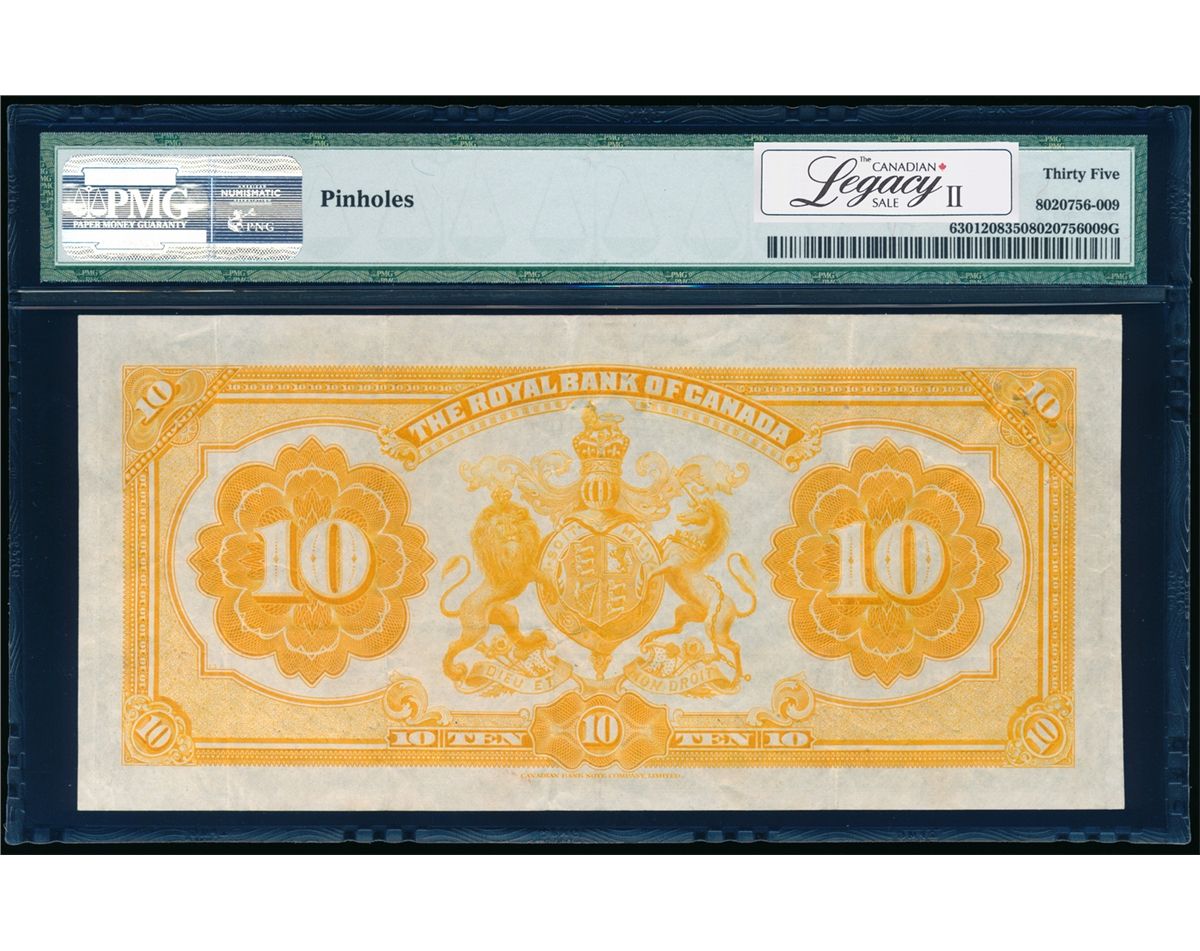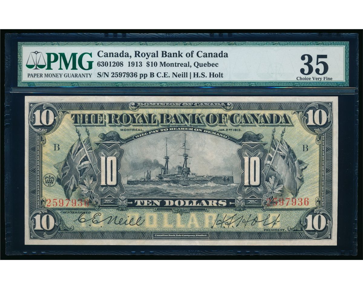 THE ROYAL BANK OF CANADA. $10.00. Jan. 2nd 1913. CH-630-12-08. Neill-Holt. No.2597936/B. PMG graded Choice Very Fine-35. (Note: pinholes).