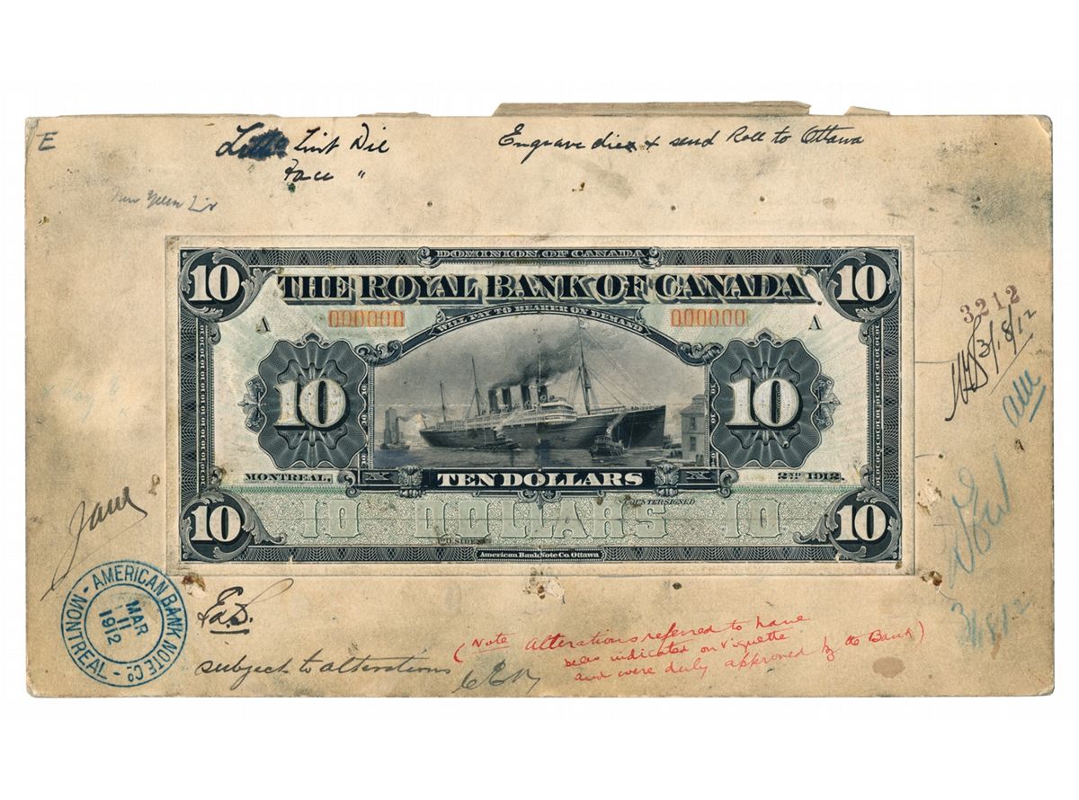 THE ROYAL BANK OF CANADA. $10.00. Jan. 2, 1912. CH-630-12-08M. A paste-up Face Proof of a model for the $10.00 issue, on a large (6" x 10") very heavy card. Central vignette of an ocean liner at dock. Various ABNC notations and bank initials and ABNC stamp 'Mar 11. 1912'. Typical ABNC workshop soiling. A unique model.