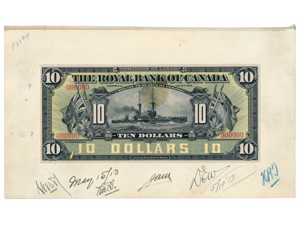 THE ROYAL BANK OF CANADA. $10.00. Jan. 2, 1913. CH-630-12-08. A full colour Face Proof on a large (5 1/2" x 9") approval card. Serial number 000000 in red, pasted on in three locations. Approval initials and dates of May 15/13 and May 19/13 written at bottom of card. Lower '10 Dollars' at signature area in yellow tint. Unc.