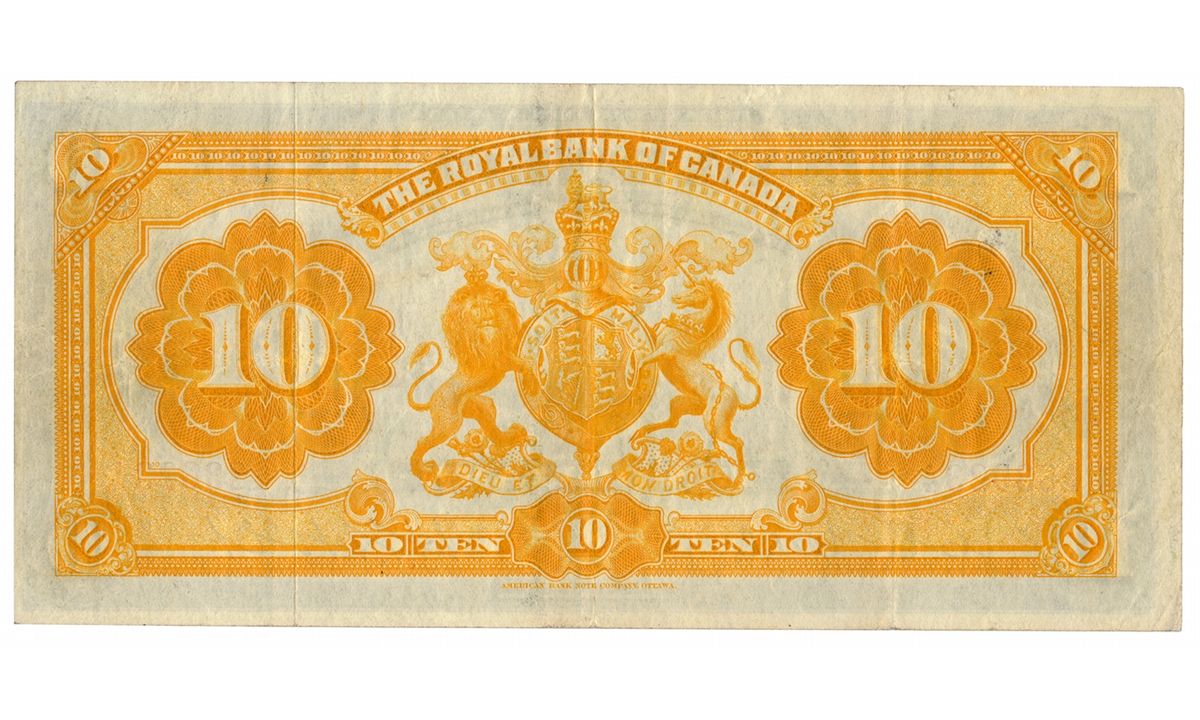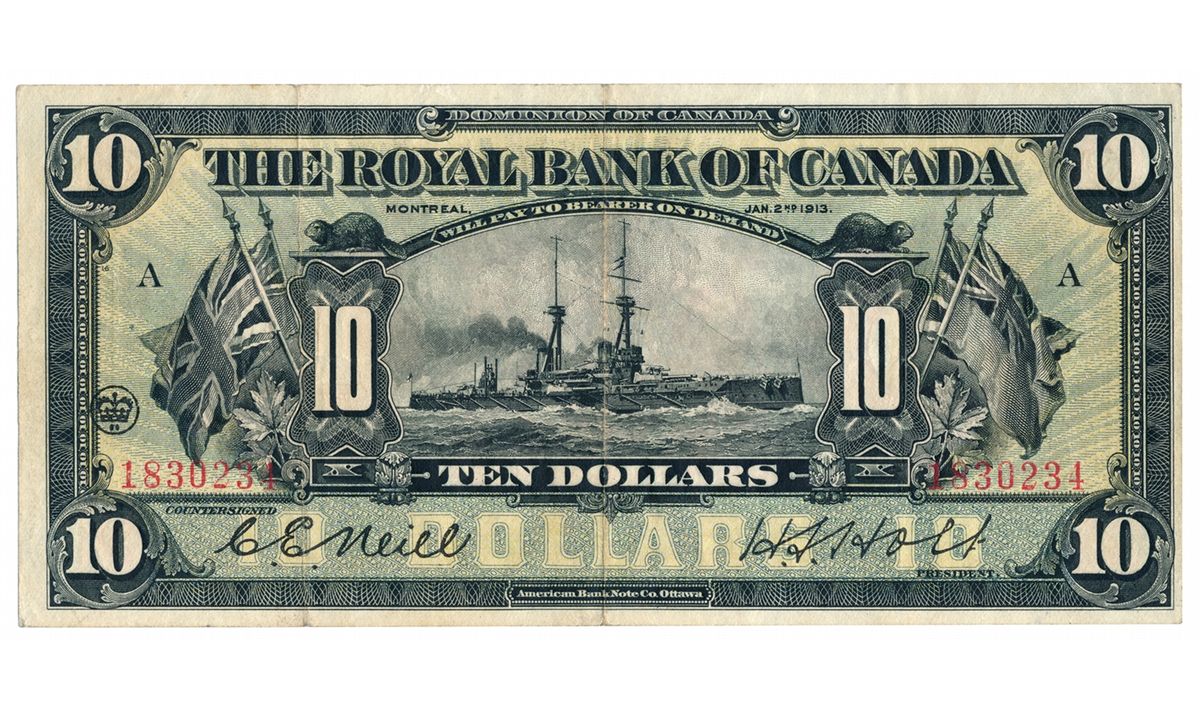 THE ROYAL BANK OF CANADA. $10.00. Jan. 2, 1913. CH-630-12-08. No. 1830234/A. Signed Neill, left. The popular battleship Bellerophon vignette at center on face. ABNC imprint. Very Fine.