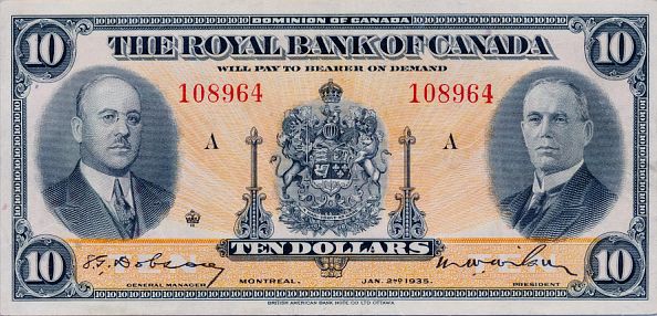 THE ROYAL BANK OF CANADA. $10.00. Jan. 2, 1935. CH-630-18-04. No. 108964/A. Signed Dobson-Wilson. Small signatures. BCS graded Very Fine-20.
