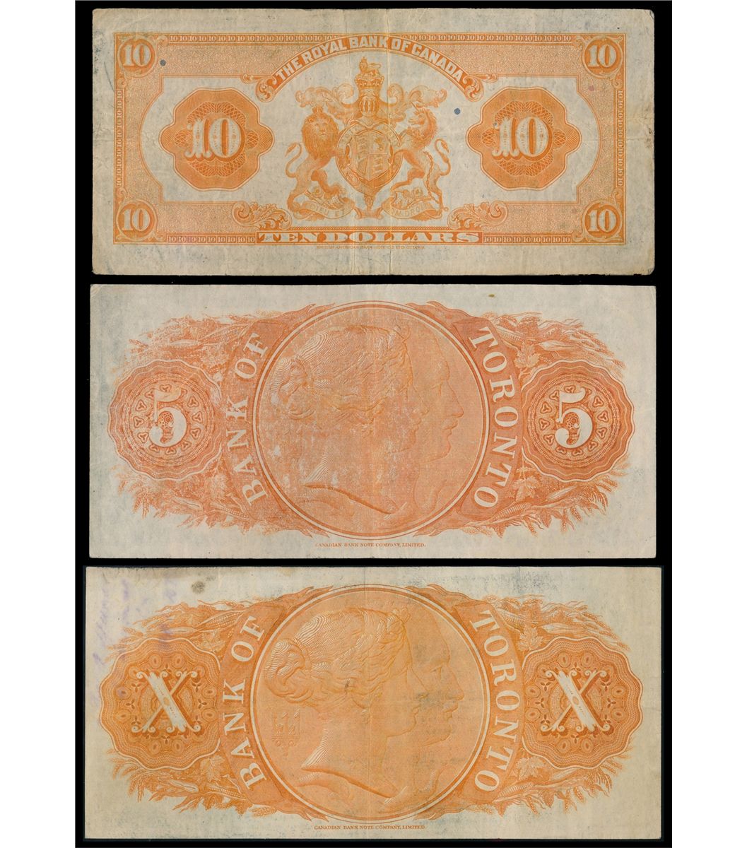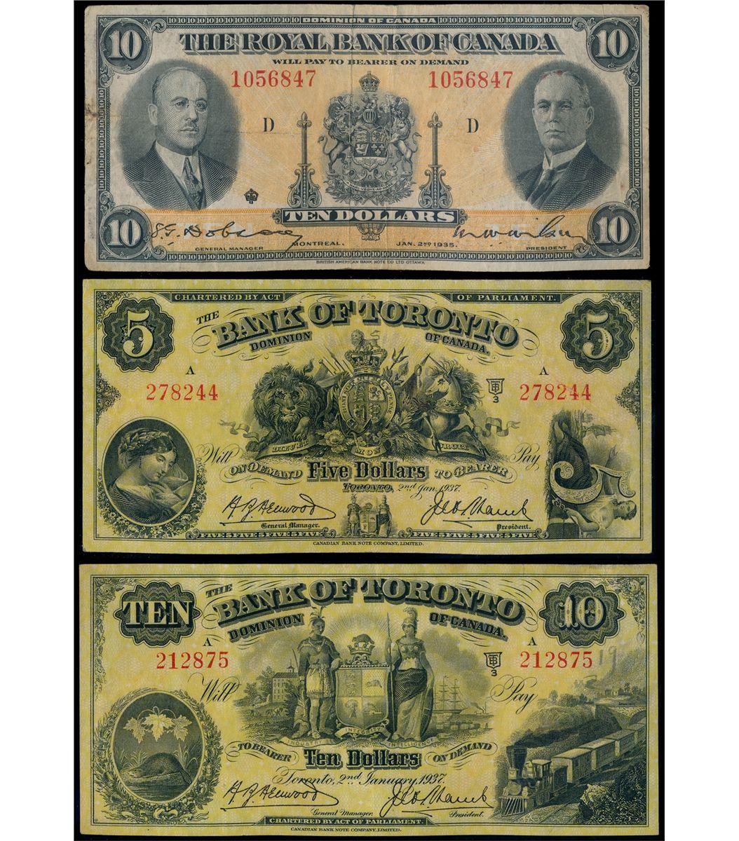 THE ROYAL BANK OF CANADA. $10.00. Jan. 2, 1935. CH-630-18-04a. No. 1056847/D. Large signatures. Fine; THE BANK OF TORONTO. $5.00. Jan. 2, 1937. CH-715-24-04. No. 278244/A. Signed H.B. Henwood, left. About Very Fine; $10.00. Jan. 2, 1937. CH-715-24-10. No. 212875/A. Signed H.B. Henwood, left. About Very Fine. Soiled. Lot of three (3) notes.