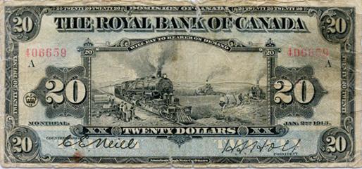THE ROYAL BANK OF CANADA. $20.00. Jan. 2, 1913. CH-630-12-12. Neill-Holt. No. 406659/A. BCS graded GOOD-6. 1/2" tear at top center. Ragged edge.