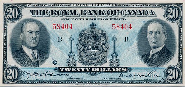THE ROYAL BANK OF CANADA. $20.00. Jan. 2, 1935. CH-630-18-06a. No. 58404/B. Signed Dobson/Wilson. Large signatures. BCS graded Extra Fine-45.