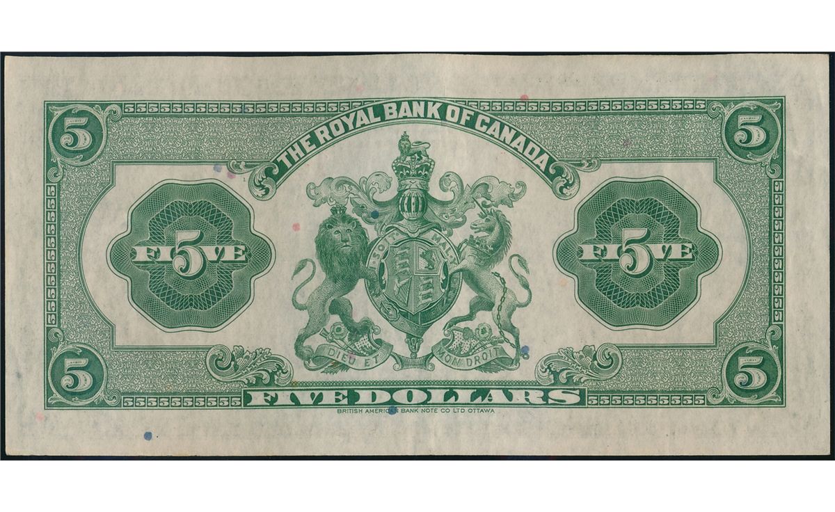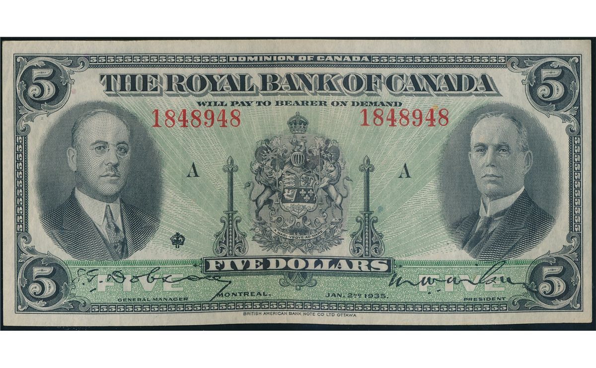 THE ROYAL BANK OF CANADA. $5.00. Jan. 2, 1935. CH-630-18-02a. No. 1848948/A. Large signatures. AU.