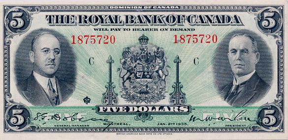 THE ROYAL BANK OF CANADA. $5.00. Jan. 2, 1935. No. 1875720/C. CH-630-18-02a. Signed Dobson-Wilson. Large signatures. BCS graded Very Fine-35.