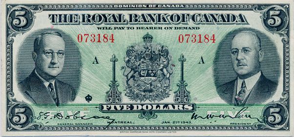THE ROYAL BANK OF CANADA. $5.00. Jan. 2, 1943. CH-630-20-02. No. 073184/A. Signed Dobson-Wilson. BCS graded Extra Fine-40, (trimmed).