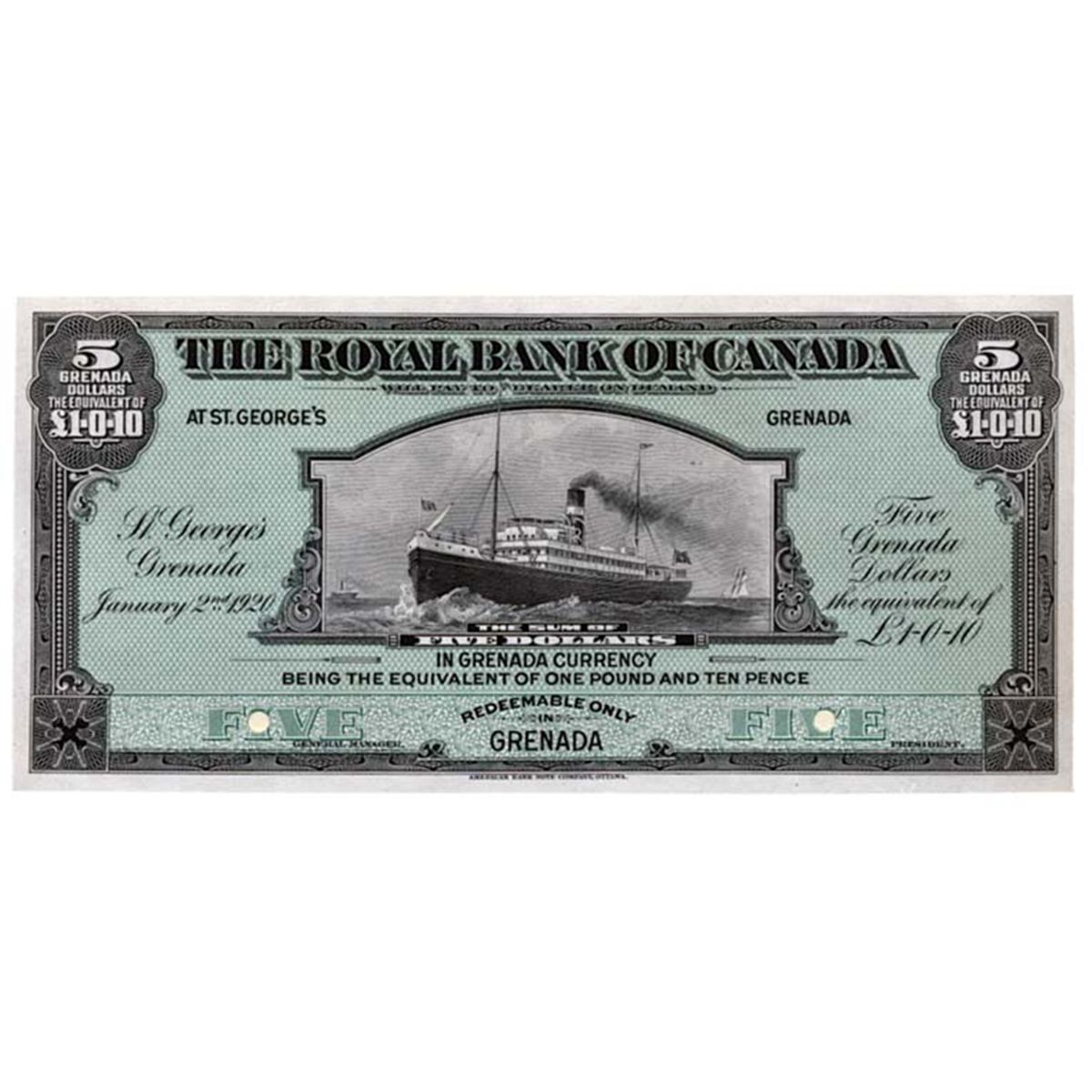 THE ROYAL BANK OF CANADA. St George’s. Grenada. $5.00. Jan. 2, 1920. CH-630-48-02P. Full colour Face and Back Proofs on large approval cards. Both pristine.