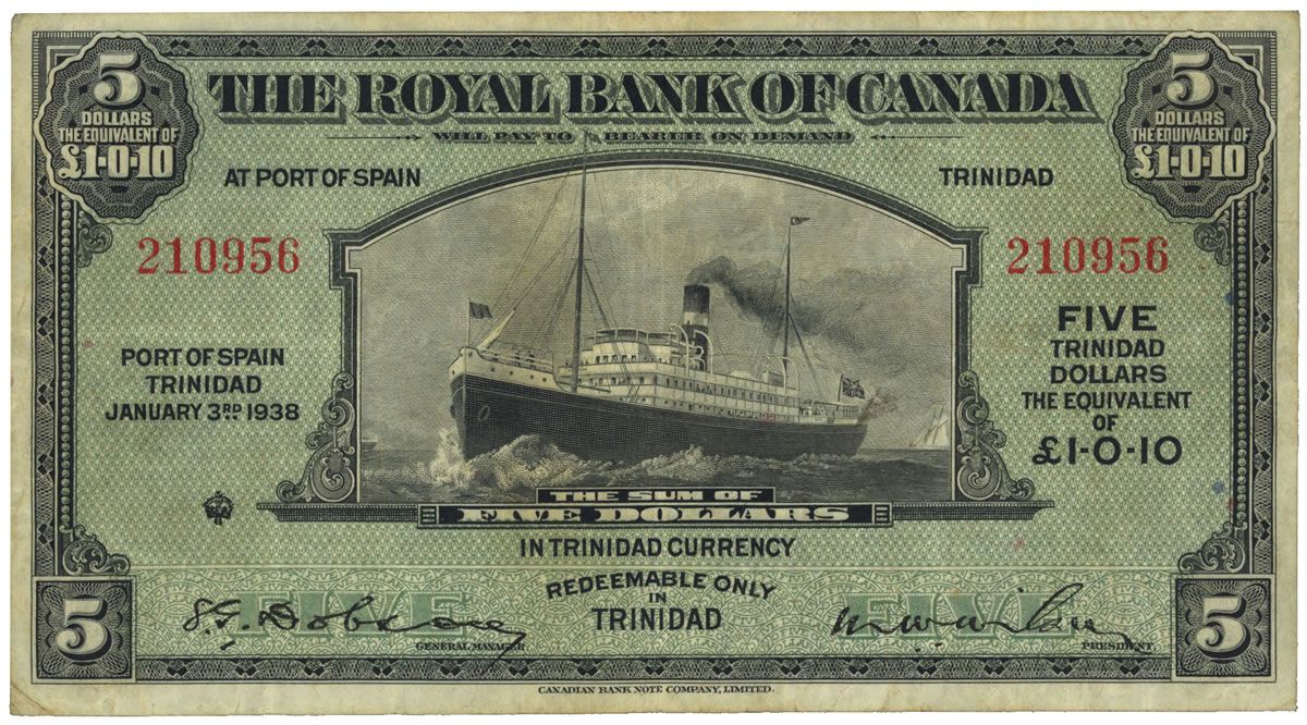 $5.00. Jan. 3, 1938. CH-630-68-02. £1-0-10 Payable at Port of Spain, Trinidad. No. 210956. PMG graded Very Fine-25.