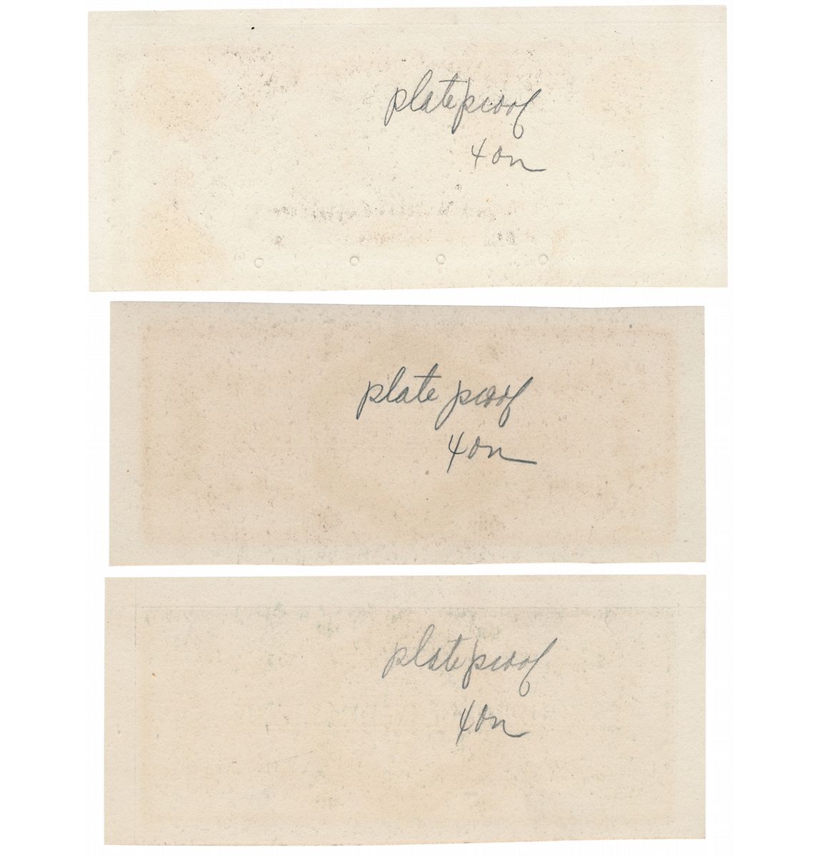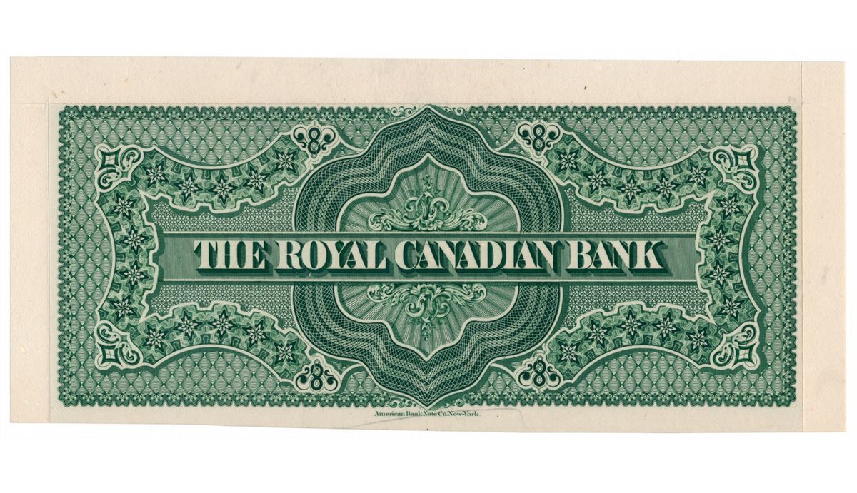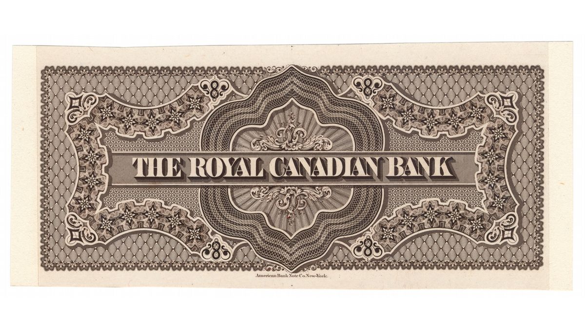 THE ROYAL CANADIAN BANK. $5.00. 18--(ca. 1865 issue). CH-635-10-02-06P. A full colour Face Proof and two Back Proofs, one in brown, one in green. Three pristine Proofs.