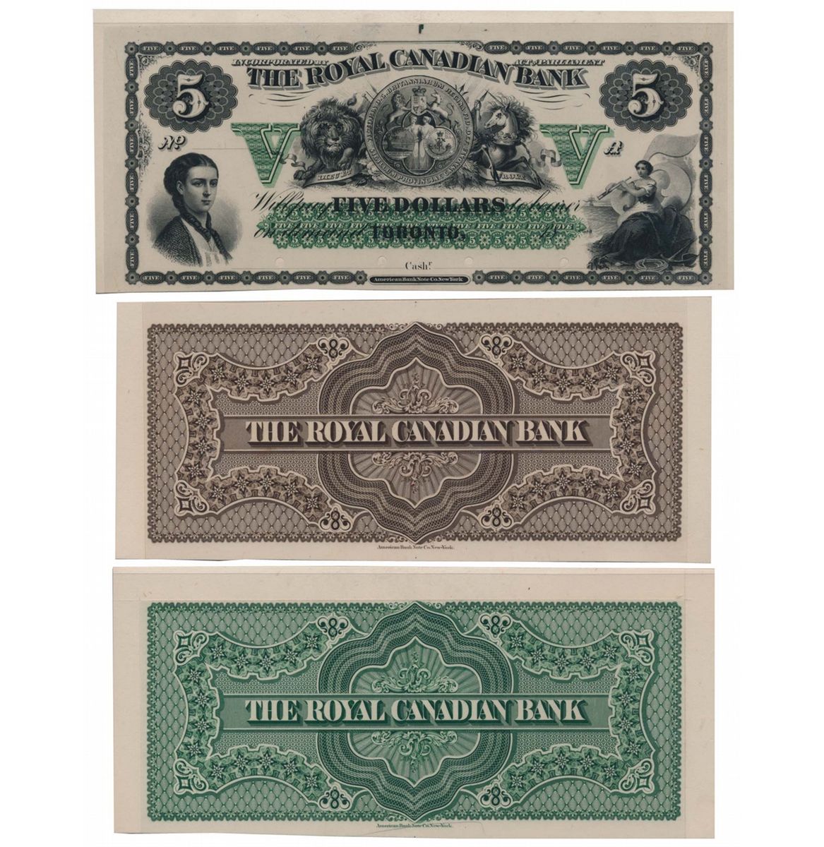 $5.00. 18-(ca.1865 issue). CH-635-10-02-06P. A full colour Face Proof and two Back Proofs, one in brown, one in green. Three pristine Proofs.