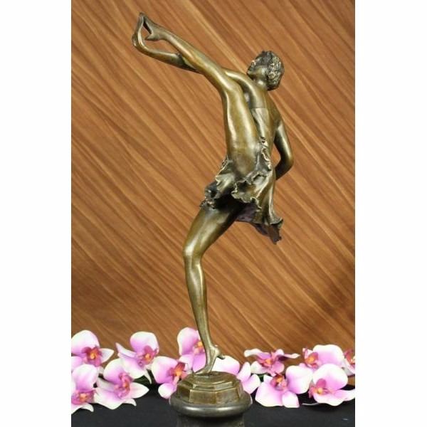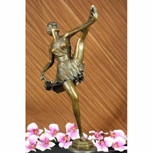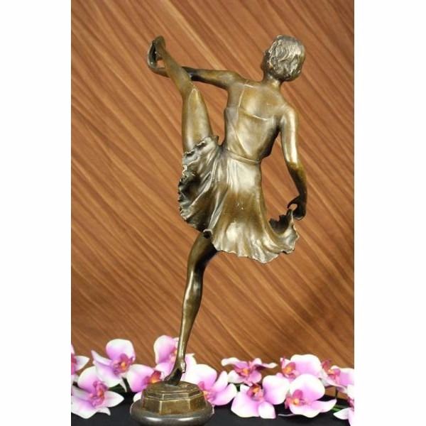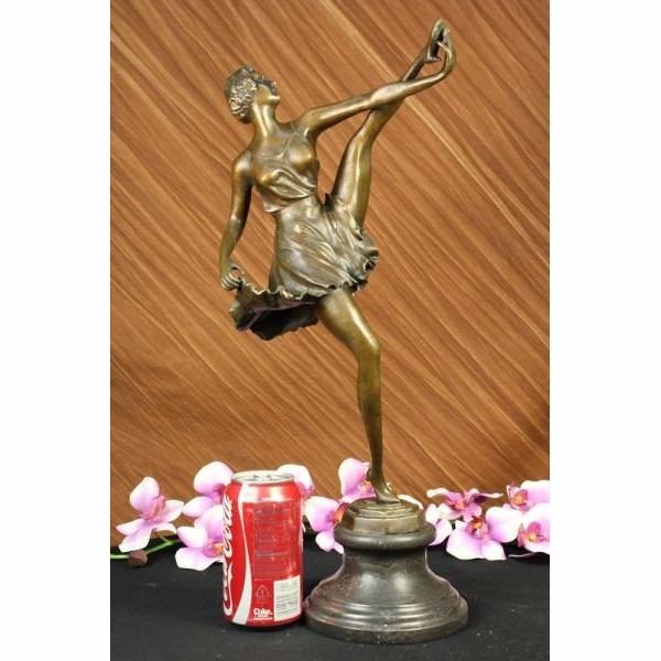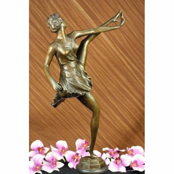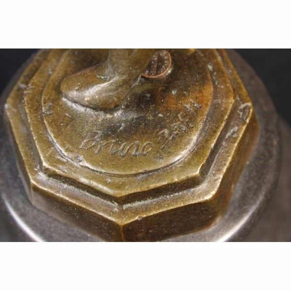 The bronze beauty boasts her dexterity by kicking her leg high andturning her left hand to touch the sole of her shoe in a seductivedance move. The method of casting, allows for the precious metal tomold to the finest level of the artist's skill. The details are soexquisite that the eyes are fooled thinking the hardness of thematerial is actually a flowing silk dress that hangs loosely andtransparent off her shapely form. She was molded using the age-oldtechnique of lost-wax casting and finished with a brown patina stainguaranteeing perpetuation. She stands upon a black marble base withthe artist Bruno Zach's signature. Bruno Zach was born in the town of Schitomir, Ukraine on the May 6,1891 and died on February 20 1945 in Vienna. He studied at the ViennaAcademy under Hans Bitterlich and Josef Mullner. The subjects ofZach's bronze works included western, orientalist, sporting andanimalier styles. However he is best known for his Art Deco subjectsof women depicted with a strident sensuality. Condition: This sculpture is in perfect condition. Bronze Dimensions with Marble Base:Height 19" X Width 12" Marble Dimensions: DIAMETER 5" Height without base: 9" Weight : 16 LBS Inventory : 63-Y0376036