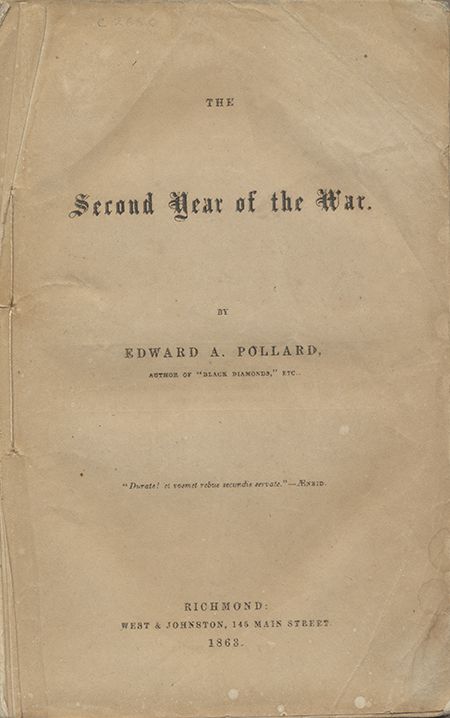 Scarce pro-Confederacy history, The Second Year of the War, by Edward A. Pollard. (Richmond: West & Johnston). 1863. 326pp. 8vo., sewn, without wraps, as issued. The second in a series of four books by the talented writer setting forth the Southern view of the progress of the war. Pollard would be captured a year after publication as he attempted to run the Northern blockade en route to England to promote the series. Very good.