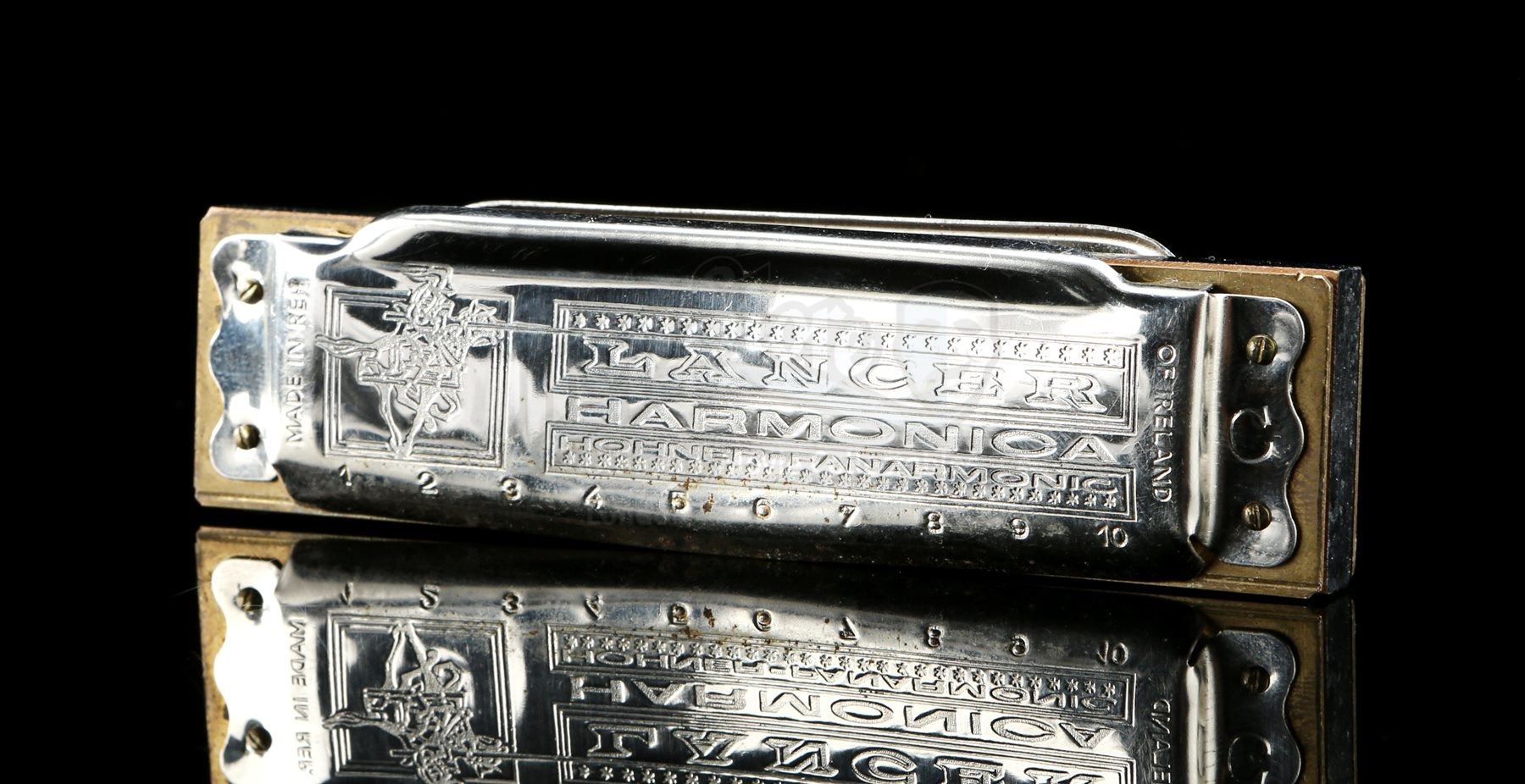 This vintage harmonica is made of metal and is engraved with the Lancer Harmonica logo and title. The functioning instrument shows a slight curvature to the top cover plate, which has bent in slightly, but the harmonica remains in very fine condition. Dimensions: 10 cm x 2.5 cm x 2 cm (4” x 1” x ¾”)
