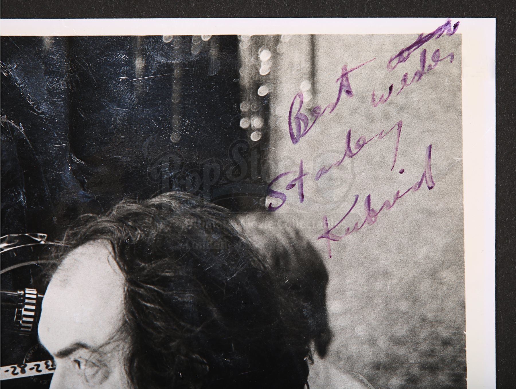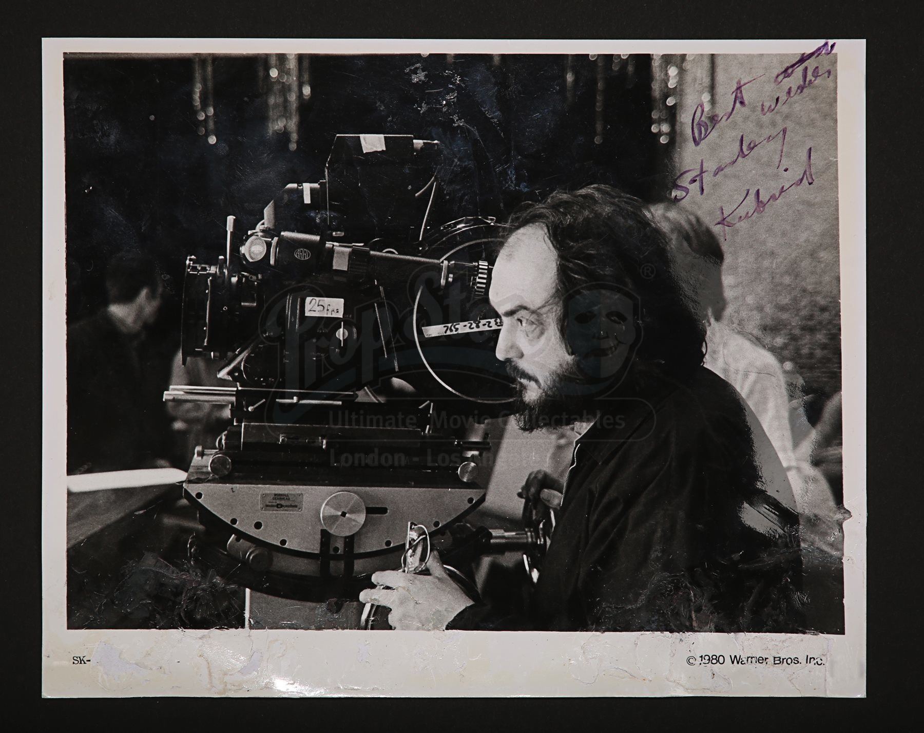 An autographed promotional photograph of Stanley Kubrick. The black-and-white photograph shows a close-up of the legendary director at work behind the camera on the exterior Overlook Hotel set for The Shining. Written in purple ink and inscribed “Best Wishes”, the image bears an earlier attempt at “wishes” which has been crossed out by Kubrick. The lower corners have suffered from water damage which has caused a loss of gloss finish to the image and copywrite text. Signature is unaffected. Dimensions: 25.5 cm x 20.5 cm (10'' x 8'')