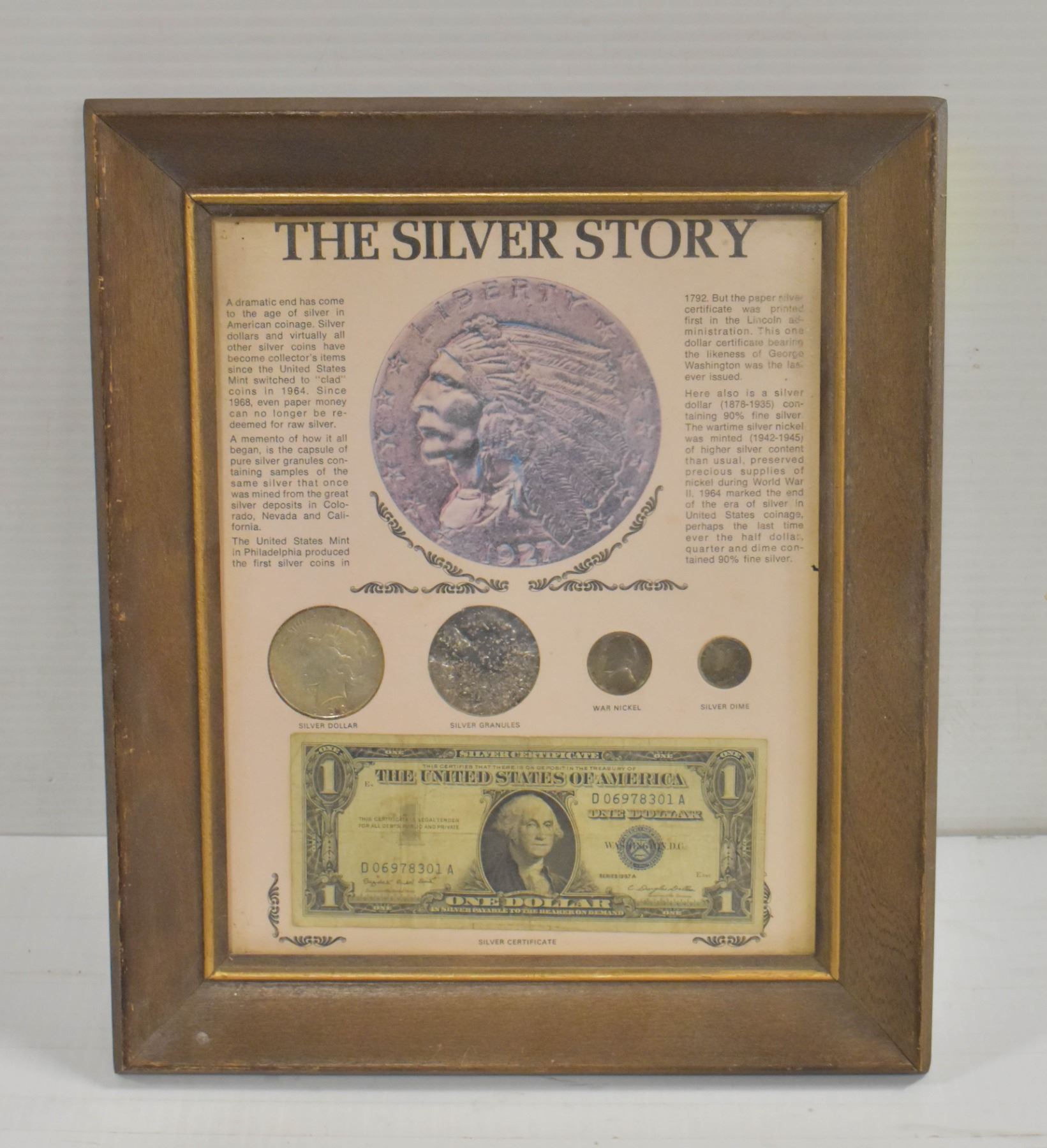 INCLUDING 1923 SILVER PEACE DOLLAR, SILVER CERTIFICATE 1957A ONE DOLLAR, SILVER GRANULES , WAR NICKEL AND SILVER DIME FRAMED 10" X 12" **ALL ITEMS MUST BE REMOVED BY 5PM SATURDAY, DECEMBER 3RD, 2022. ALL REMAINING ITEMS WILL BE SUBJECT TO A $6.00 PER DAY STORAGE CHARGE. ANY ITEMS REMAINING AFTER MONDAY, DECEMBER 18TH, 2022 WILL BE CONSIDERED FORFEITED. NO REFUNDS WILL BE ISSUED FOR FORFEITED ITEMS. TO SCHEDULE A PICK UP APPOINTMENT CLICK HERE