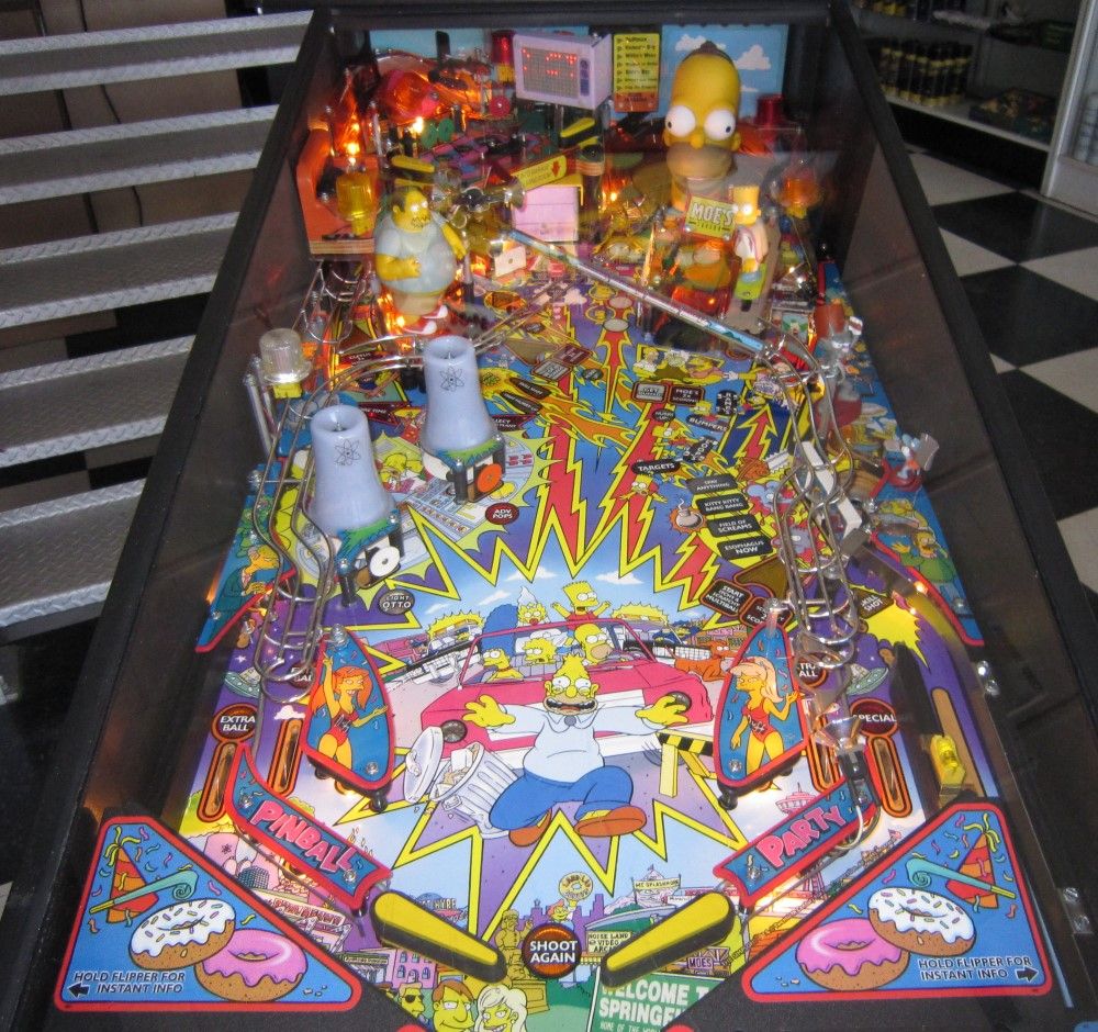 The adventures of America's most colorful family, THE SIMPSONS, are transformed into a wild affair in STERN Pinball's newest pinball machine, THE SIMPSONS PINBALL PARTY. The game features many of THE SIMPSONS favorite characters on a two-level playfield, complete with game modes influenced by various classic SIMPSONS' episodes. The object of THE SIMPSONS PINBALL PARTY is to help the citizens of Springfield to party like there's no tomorrow. The game features a talking-moving Homer head and Bart on a skateboard attached to a captive ball feature, as well as Itchy & Scratchy drop targets and Comic Book Guy. This game is in great condition and plays perfectly.