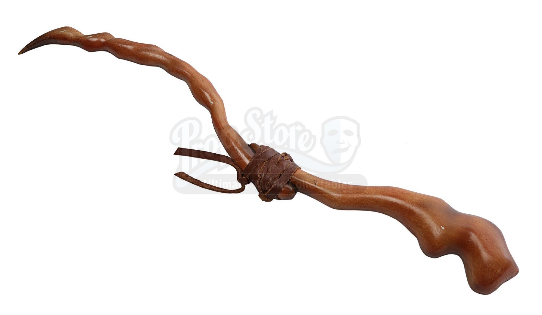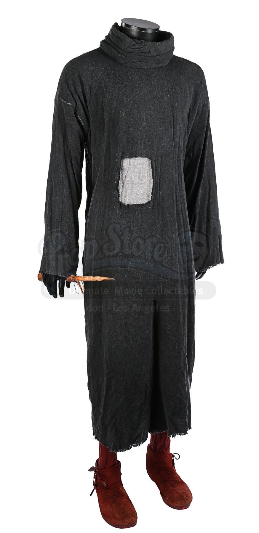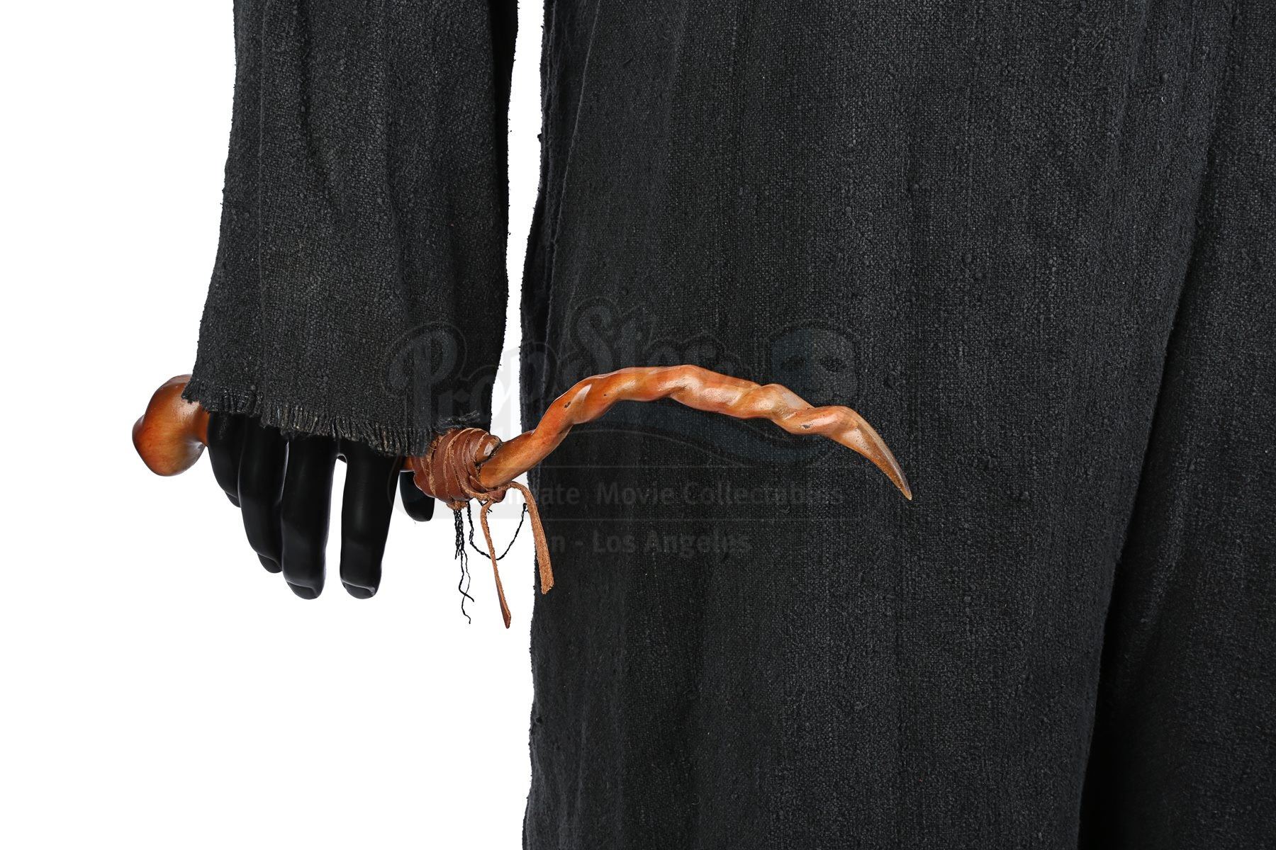 Finished in brown to replicate the appearance of carved wood, the wand is constructed from dense rubber and features brown leather cord tied around the middle. The robe has been intentionally distressed for production use and the wand displays minor paint wear. Dimensions (wand): 36 cm x 3 cm x 8 cm (14 ¼” x 1 ¼” x 3 ¼”)