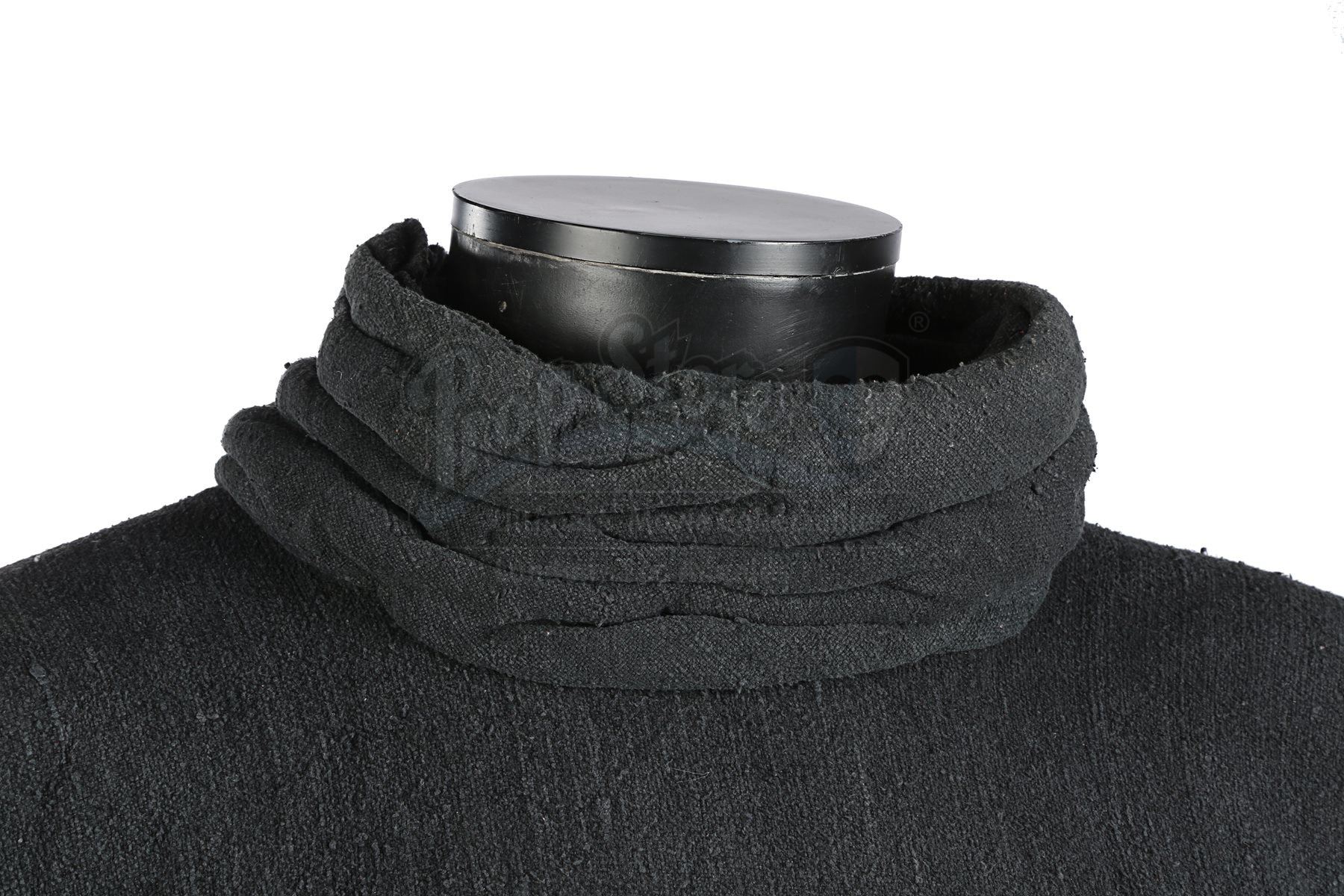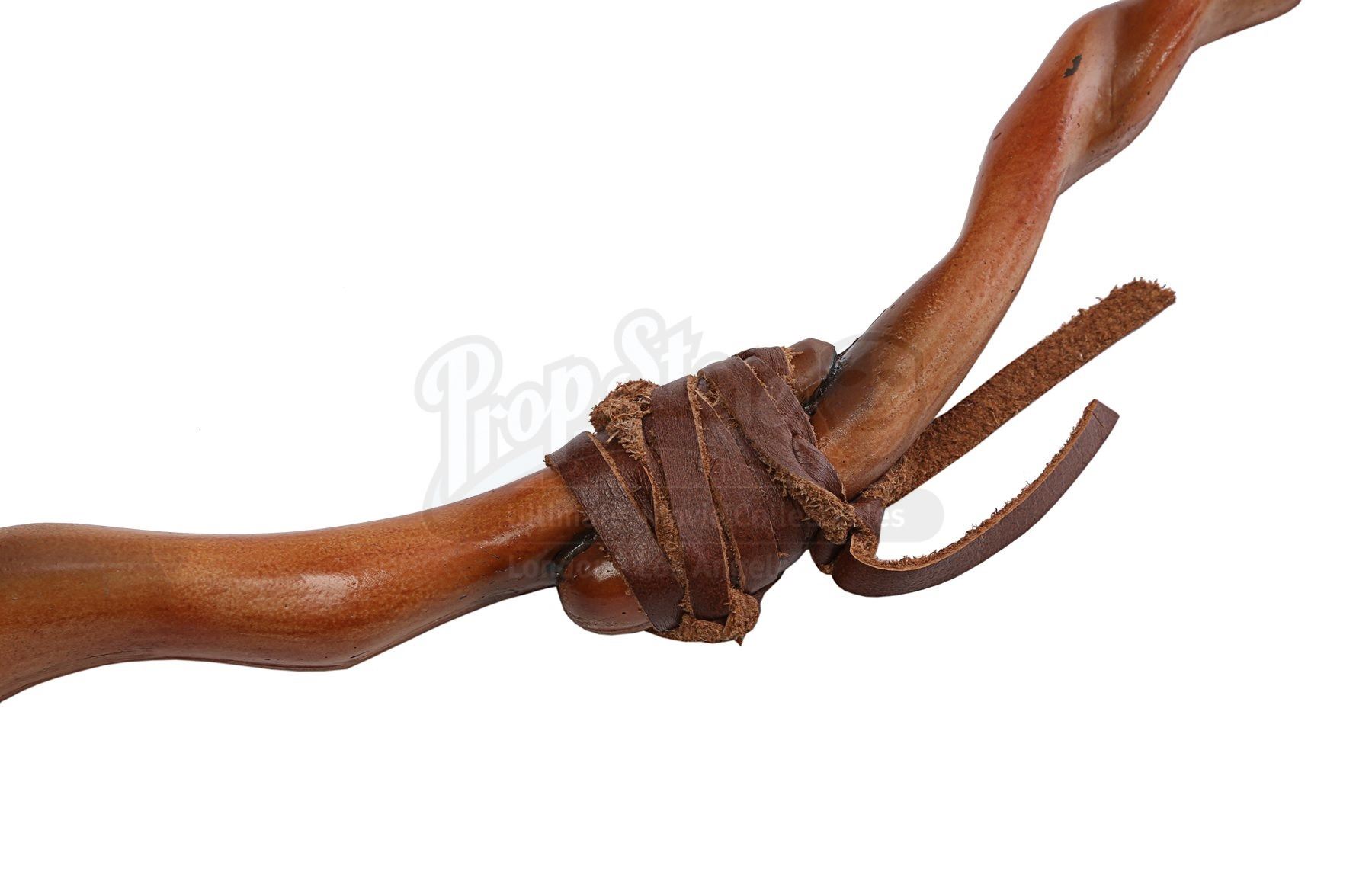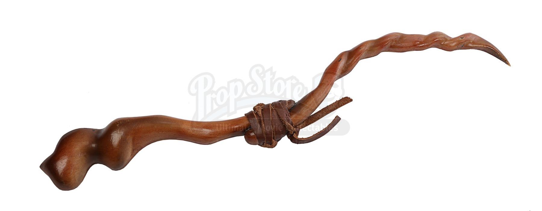 Finished in brown to replicate the appearance of carved wood, the wand is constructed from dense rubber and features brown leather cord tied around the middle. The robe has been intentionally distressed for production use and the wand displays minor paint wear. Dimensions (wand): 36 cm x 3 cm x 8 cm (14 ¼” x 1 ¼” x 3 ¼”)