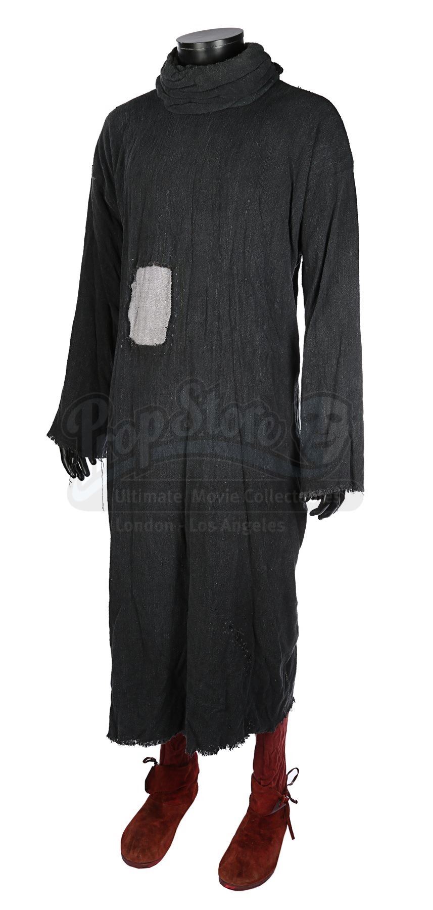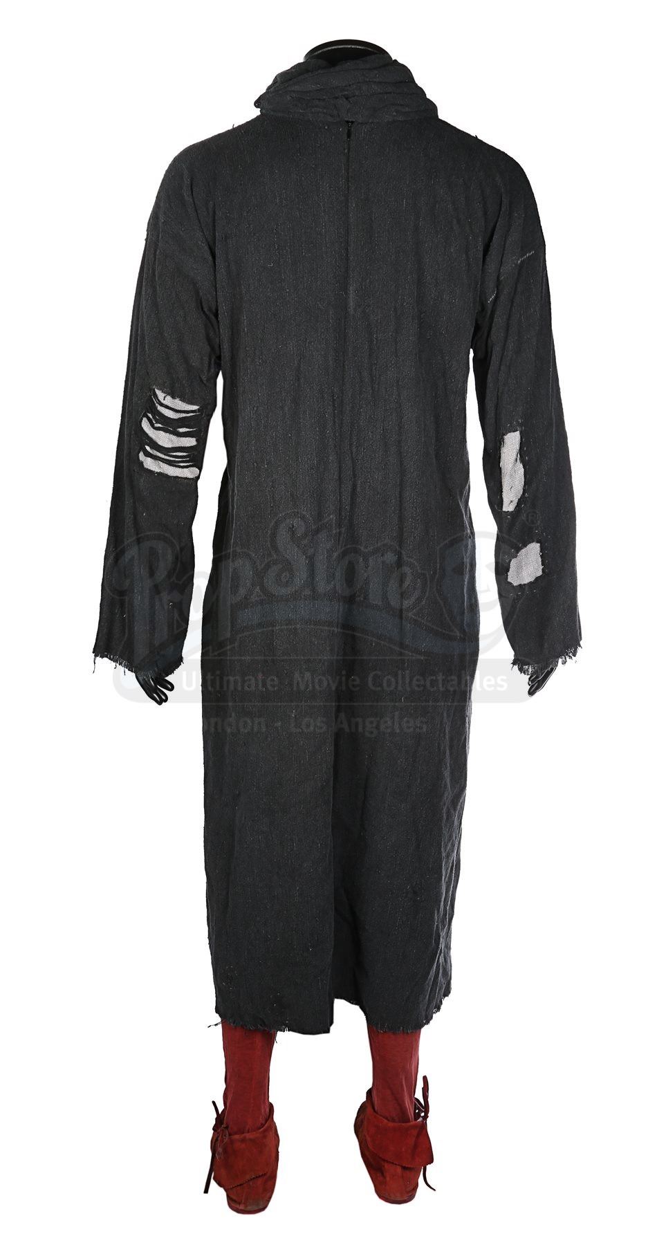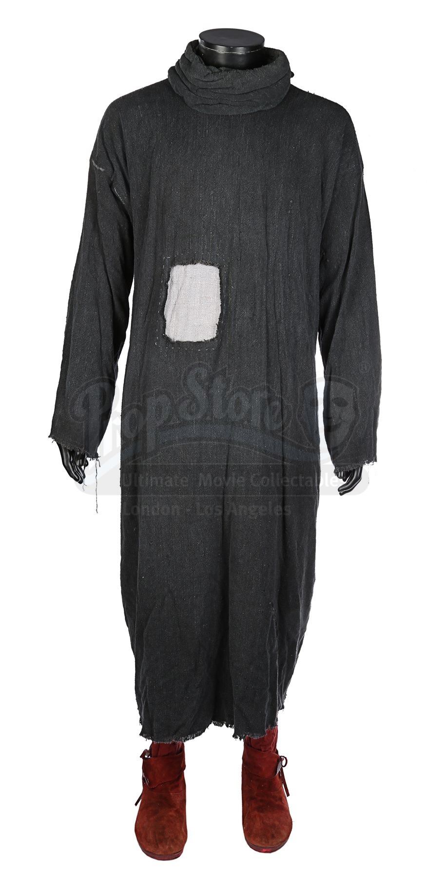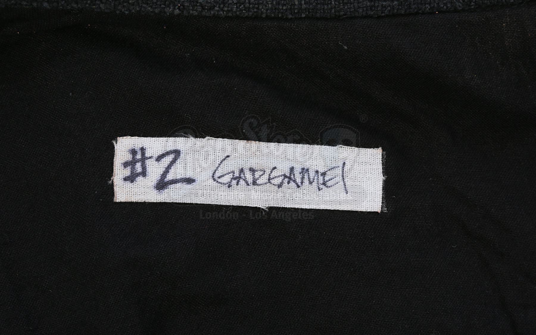 The costume consists of a tattered robe, red long johns and suede shoes with red lining. Made from black linen, the robe features decorative grey patches, with a label reading “#2 Gargamel” adhered to the inside.