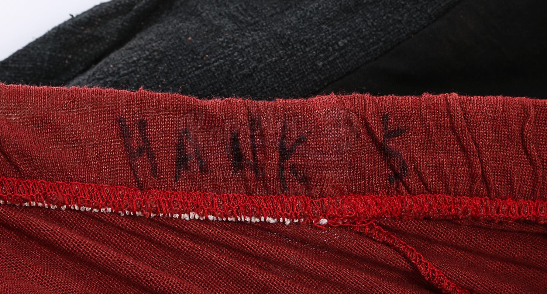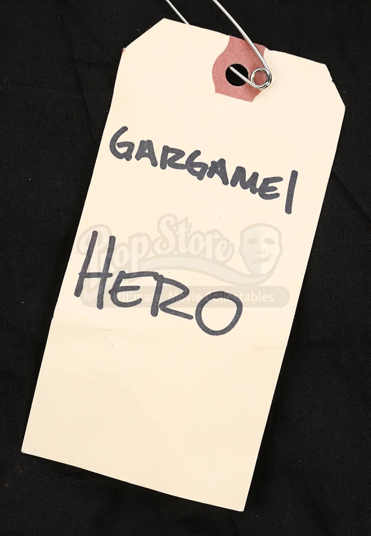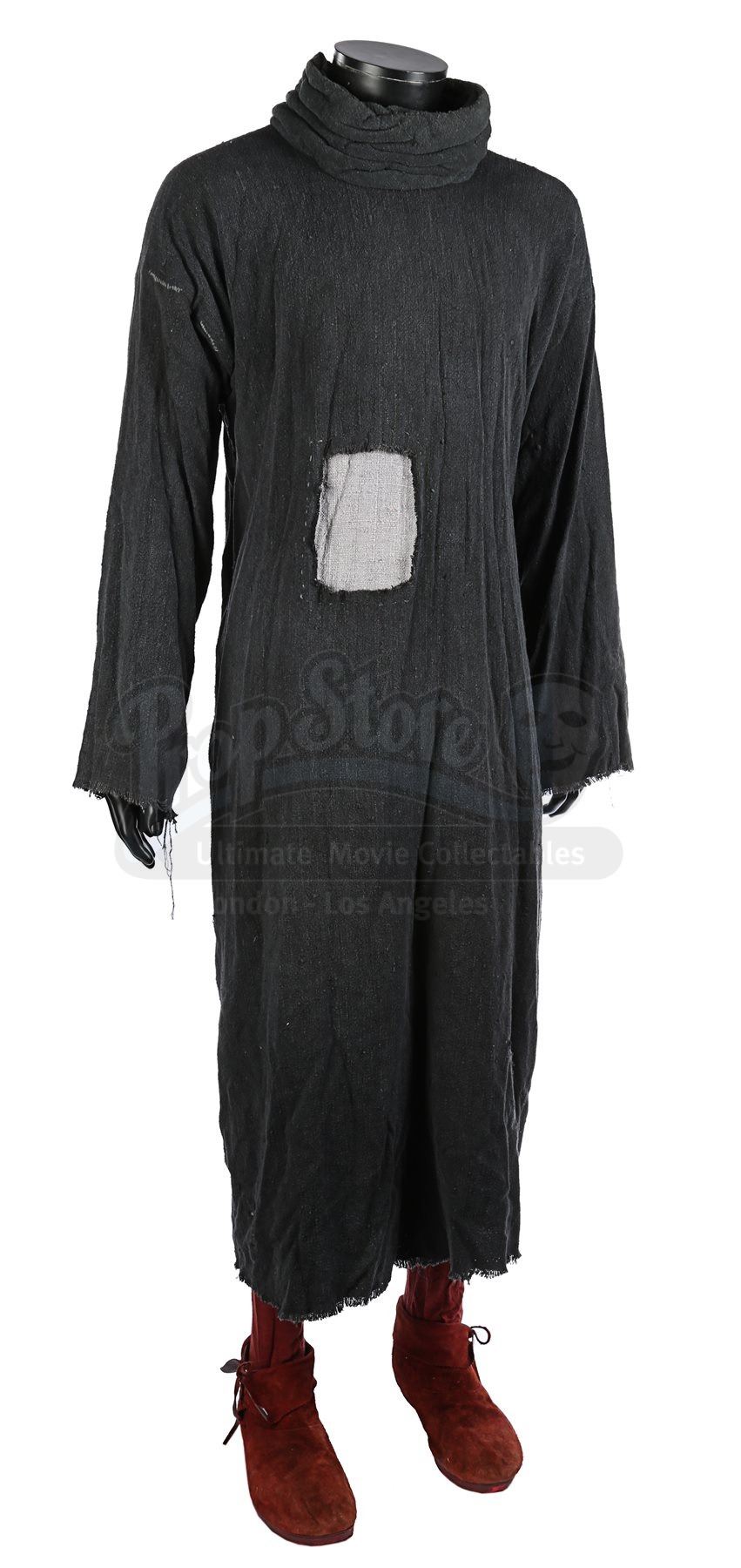The costume consists of a tattered robe, red long johns and suede shoes with red lining. Made from black linen, the robe features decorative grey patches, with a label reading “#2 Gargamel” adhered to the inside.