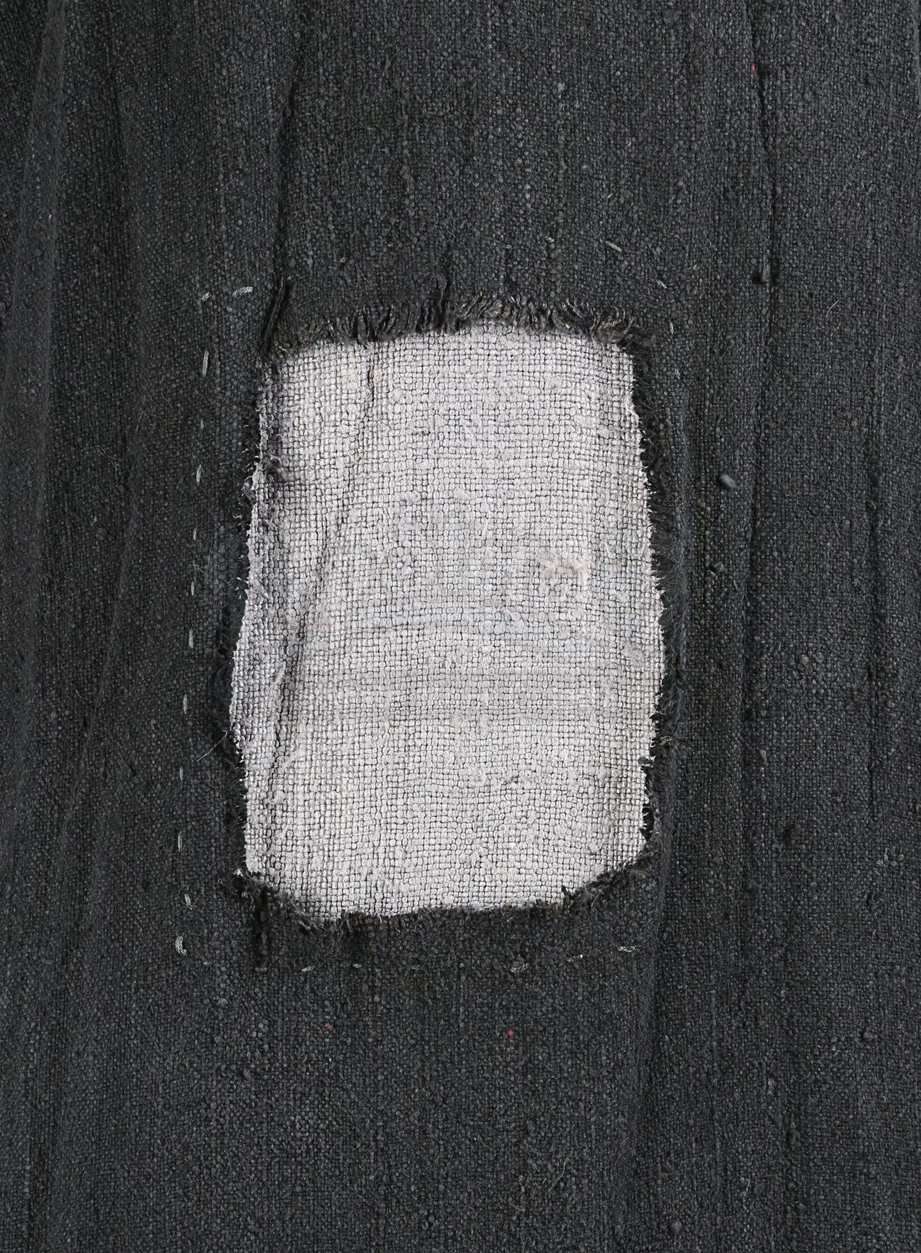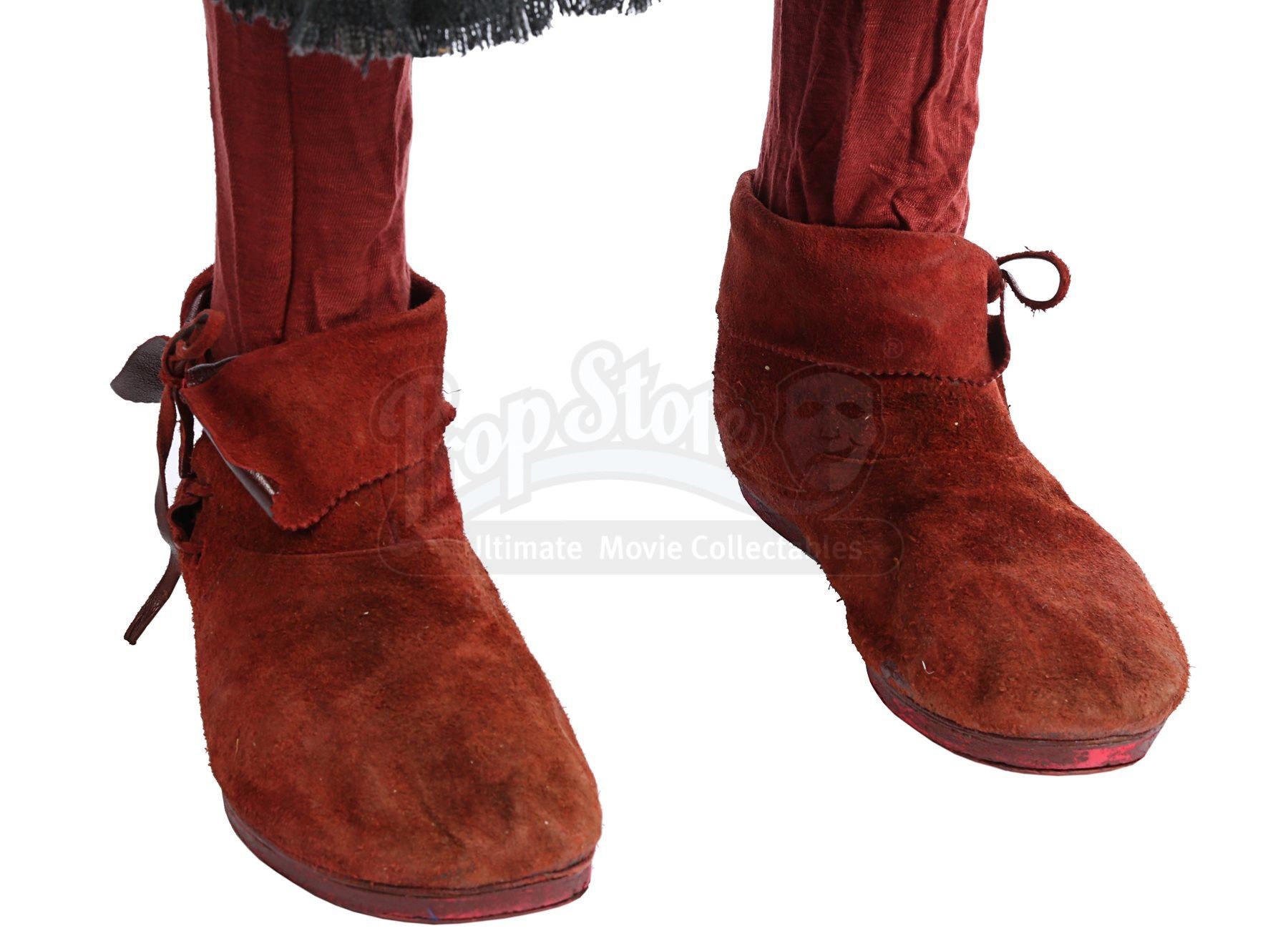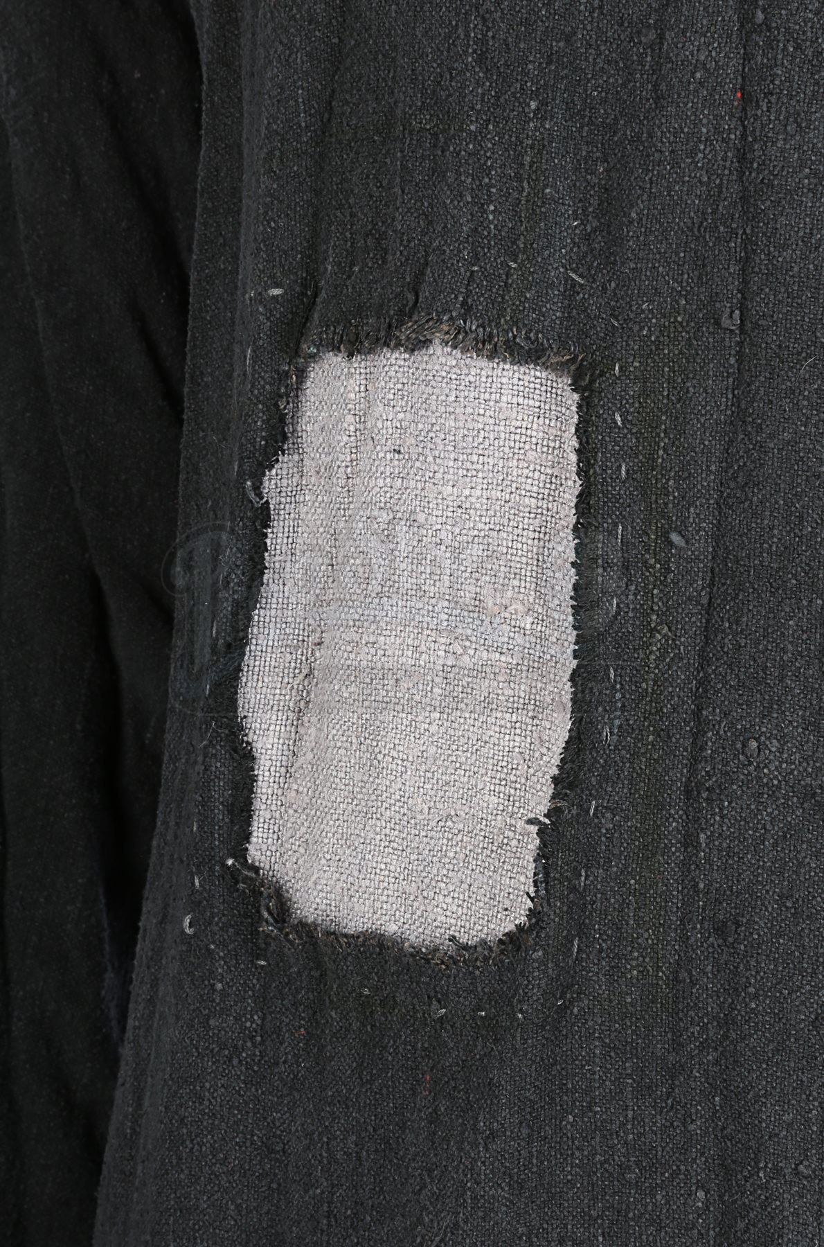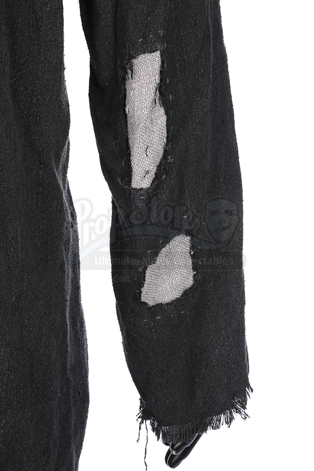 The costume consists of a tattered robe, red long johns and suede shoes with red lining. Made from black linen, the robe features decorative grey patches, with a label reading “#2 Gargamel” adhered to the inside.