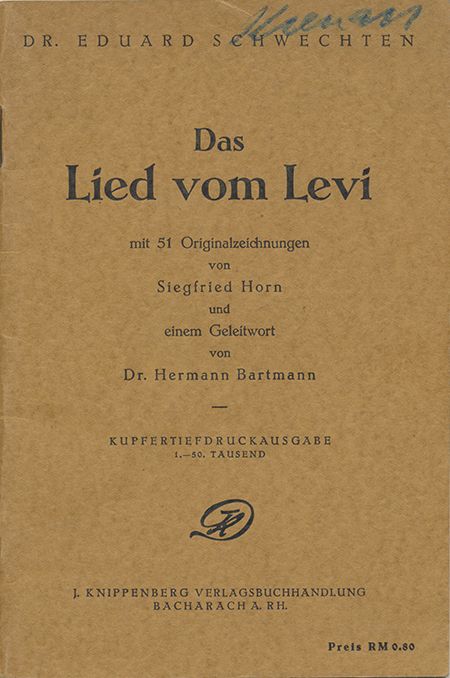 A truly awful anti-Semitic children's book, the excessively rare Das Lied vom Levi ("The Song of Levi") by Dr. Eduard Schwechten, 1933 edition of a 1895 tract, J. Knippenberg Kunstverlag, Dusseldorf, 1933. 32pp., 51 illustrations by Siegfried Horn. A lengthy children's poem heavily illustrated with caricatures of Jews as bankers and money-hoarders, with a snake-like "Jew" eventually slain by a Norseman The final rhyme ends: "Oh Lord, give us Moses back, let him lead his followers back to the holy land, let the sea divide again, the water column strong as a wall of rocks, and when all the Jews are in the gully, oh Lord then close the lid, and all people have peace." On the last page the publisher is advertising a collection of slides suitable for an evening of pleasant entertainment. Very good.