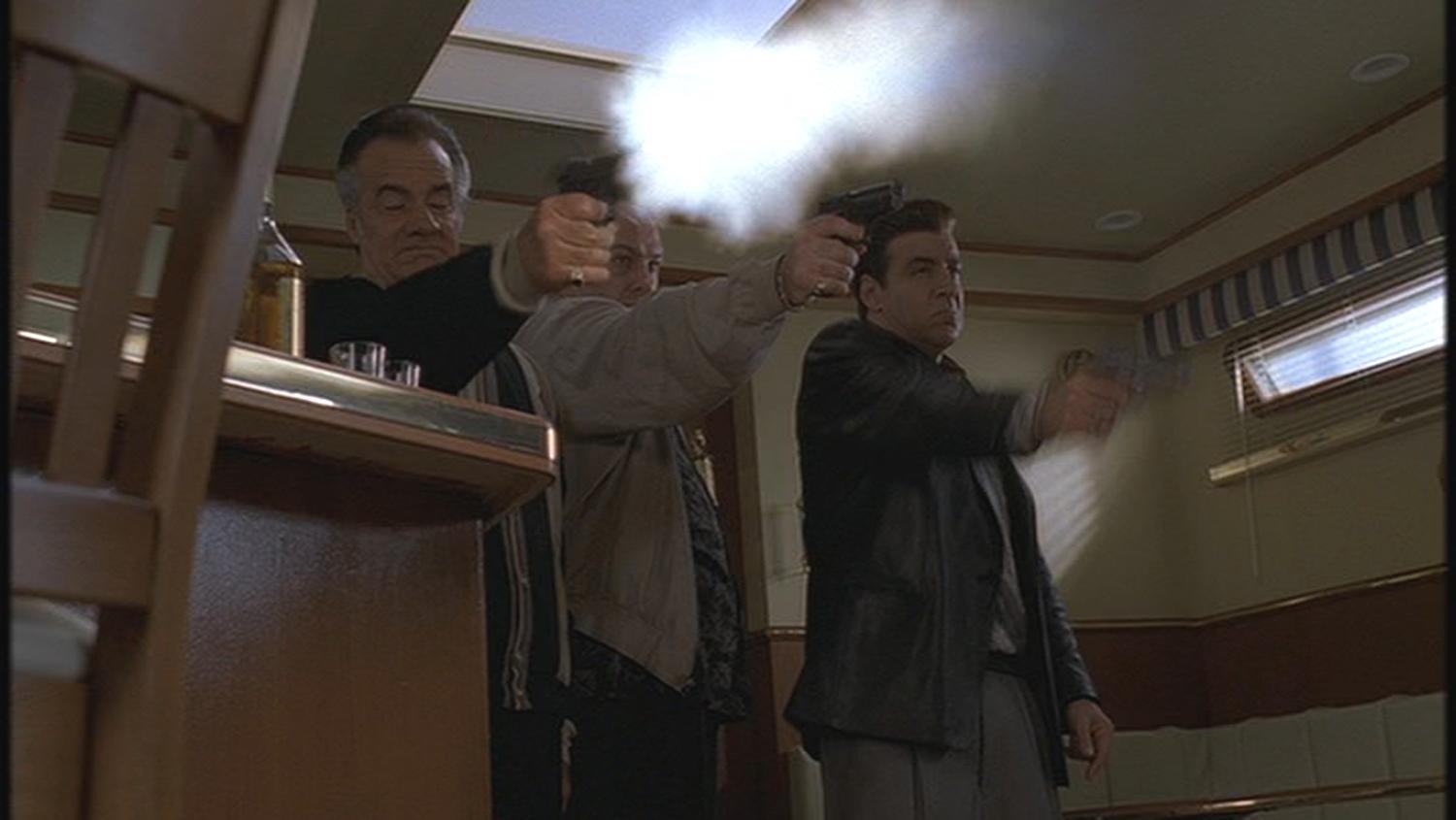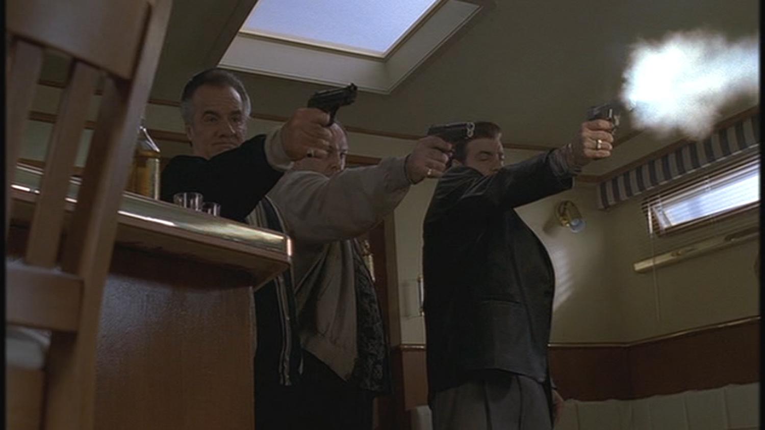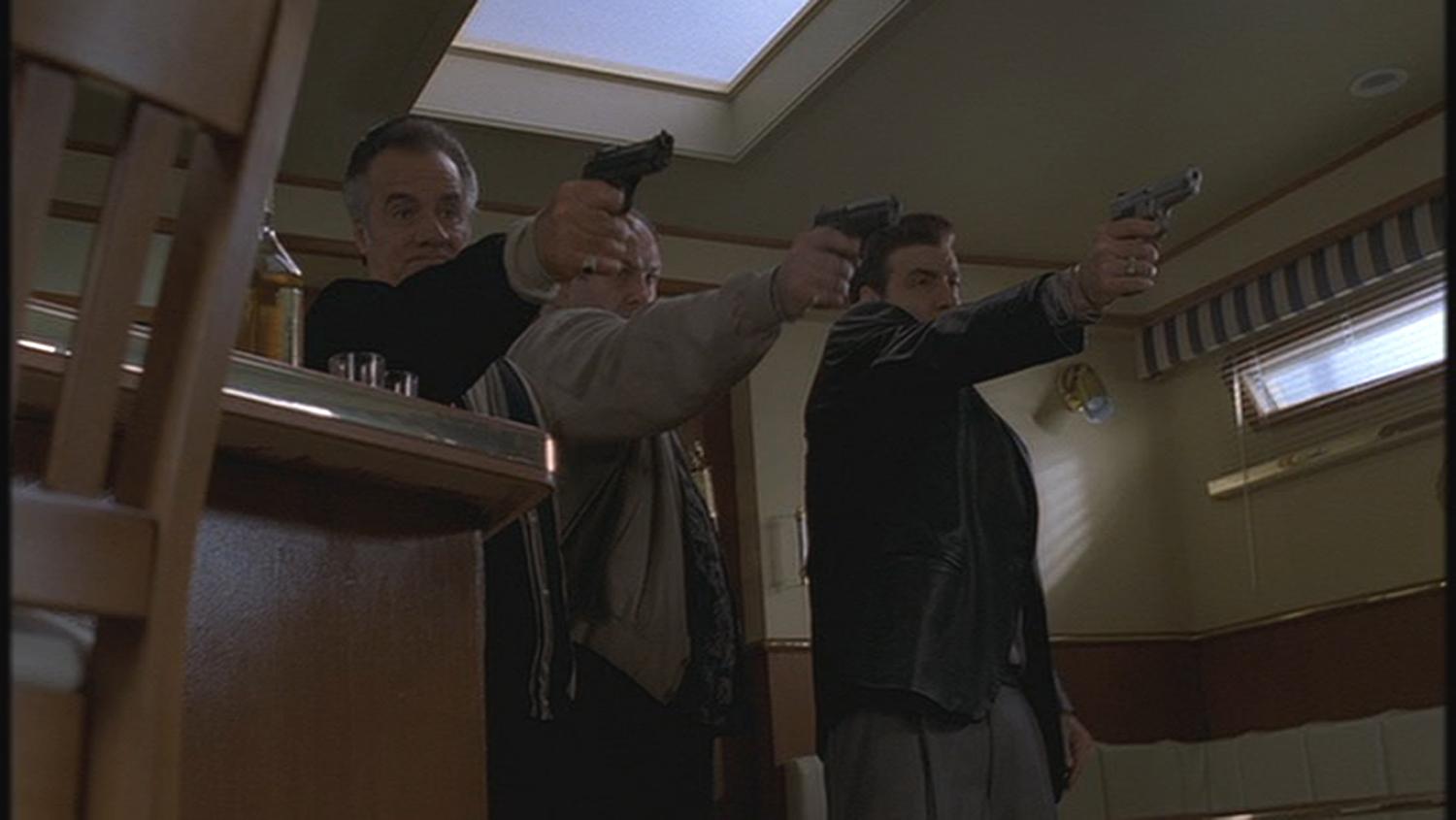 This live firing Smith & Wesson 5946 was used by the character Silvio Dante portrayed by Steven Van Zandt in the award winning series “The Sopranos”. Mr. Van Zandt can be seen firing the weapon in “Funhouse” (Season 2, Episode 13) during the sequence in the galley of the Stugots where Silvio, Paulie (Tony Sirico) and their boss Tony Soprano (James Gandolfini) finally confront “Big Pussy” Bonpensiero (Vincent Pastore) after confirming that he’s been wearing a wire for the feds. After pumping him for information, the three mobsters drink a round of tequila with their former friend and then all three open fire on him and kill him before removing his jewelry and chucking his weighted body overboard into the sea.