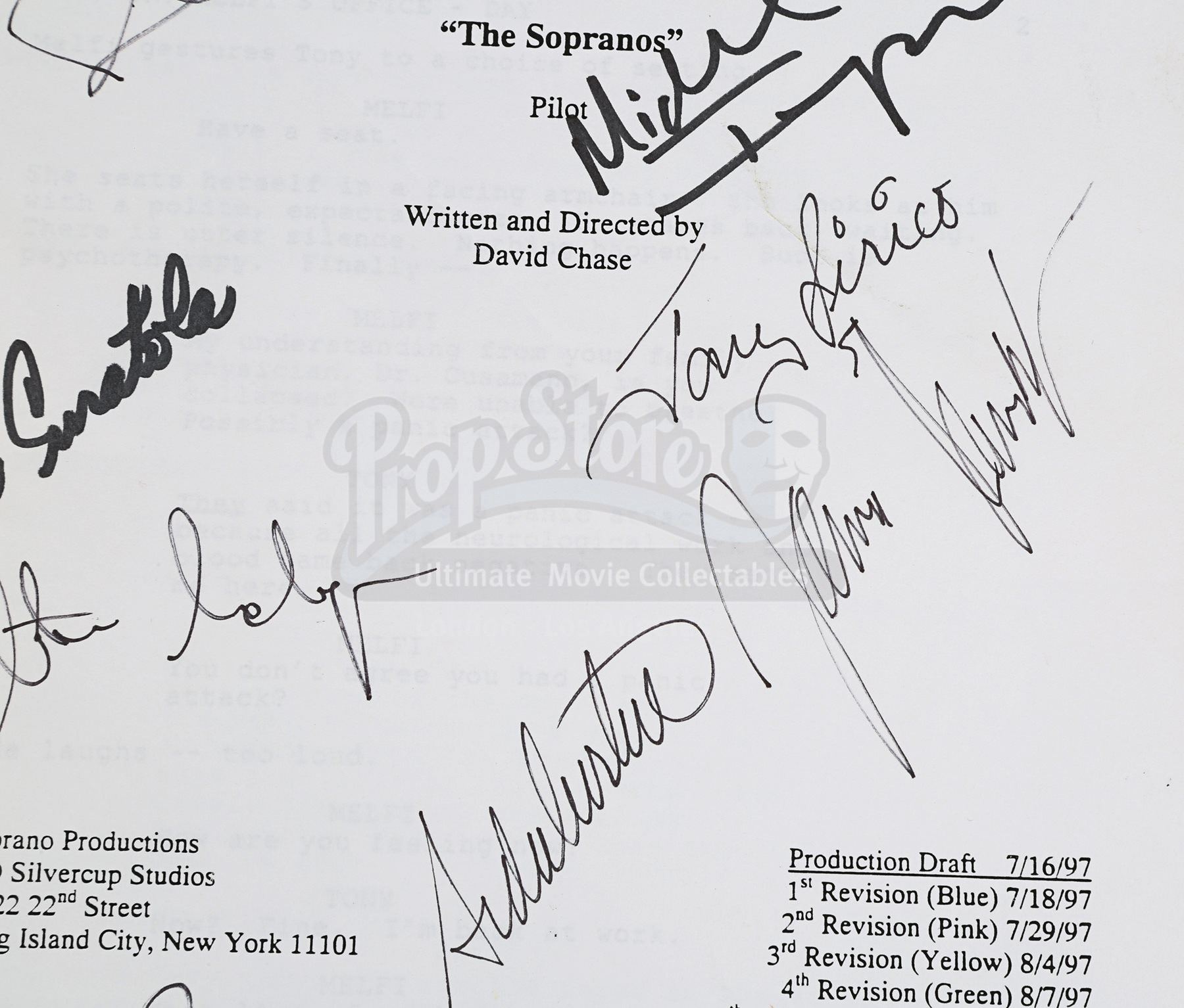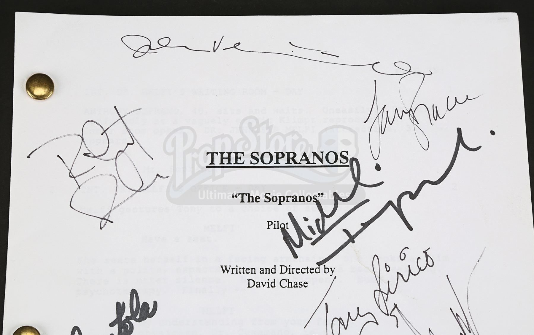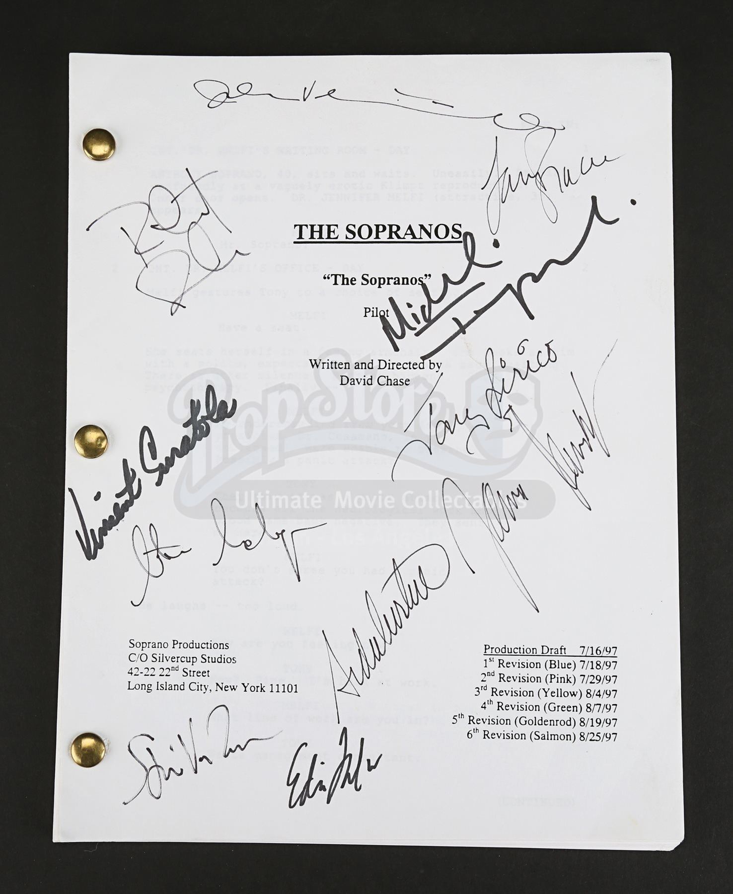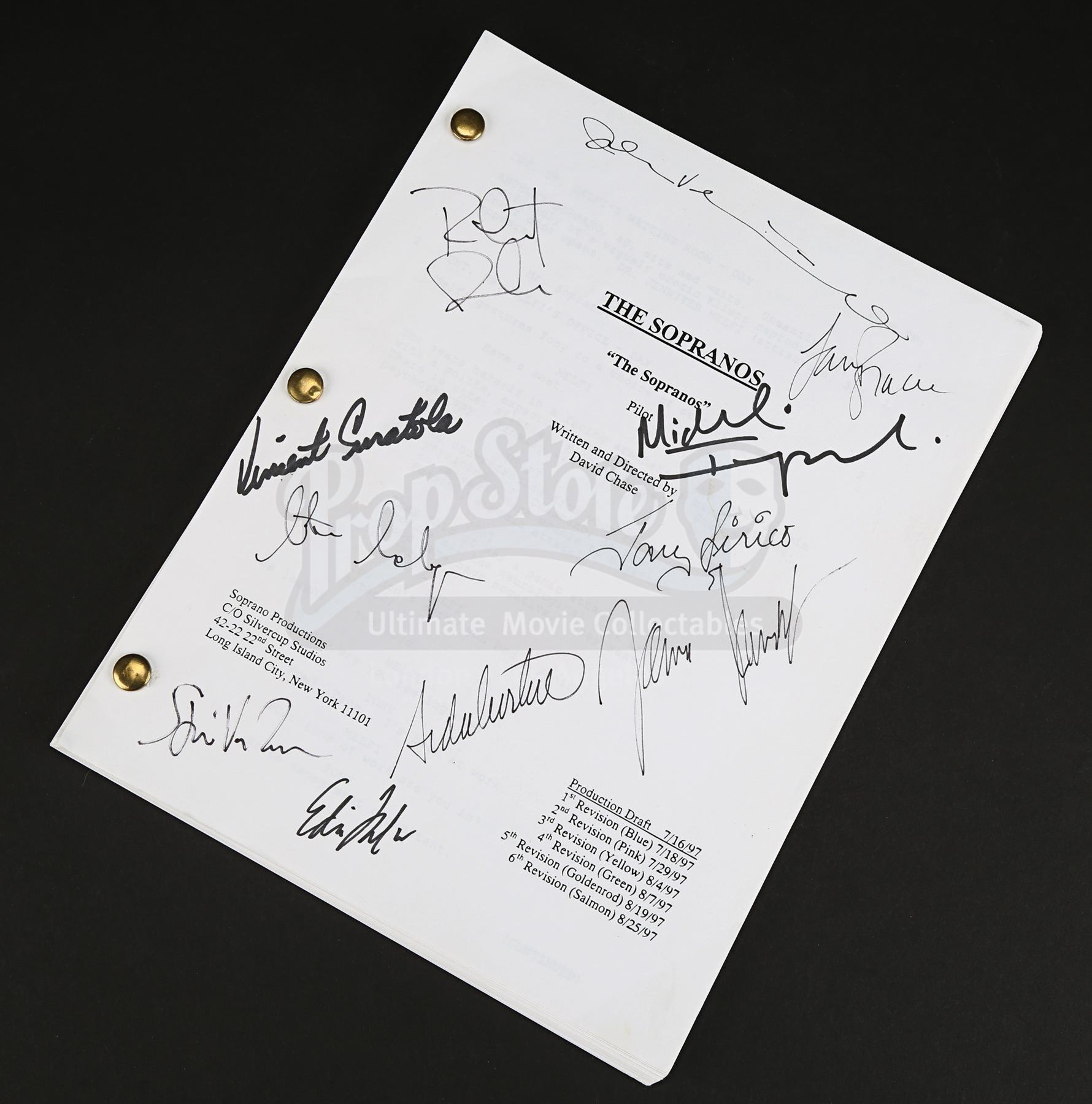 An autographed production-used script from gangster-drama television series The Sopranos. Written by David Chase, this salmon revision script for the pilot episode is dated 25 August 1997 and contains 65 U.S. Letter pages, bound together with three brass split pins.