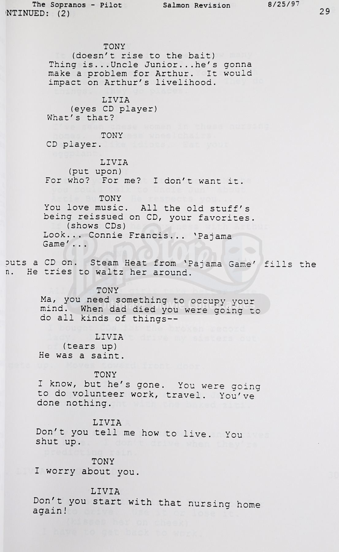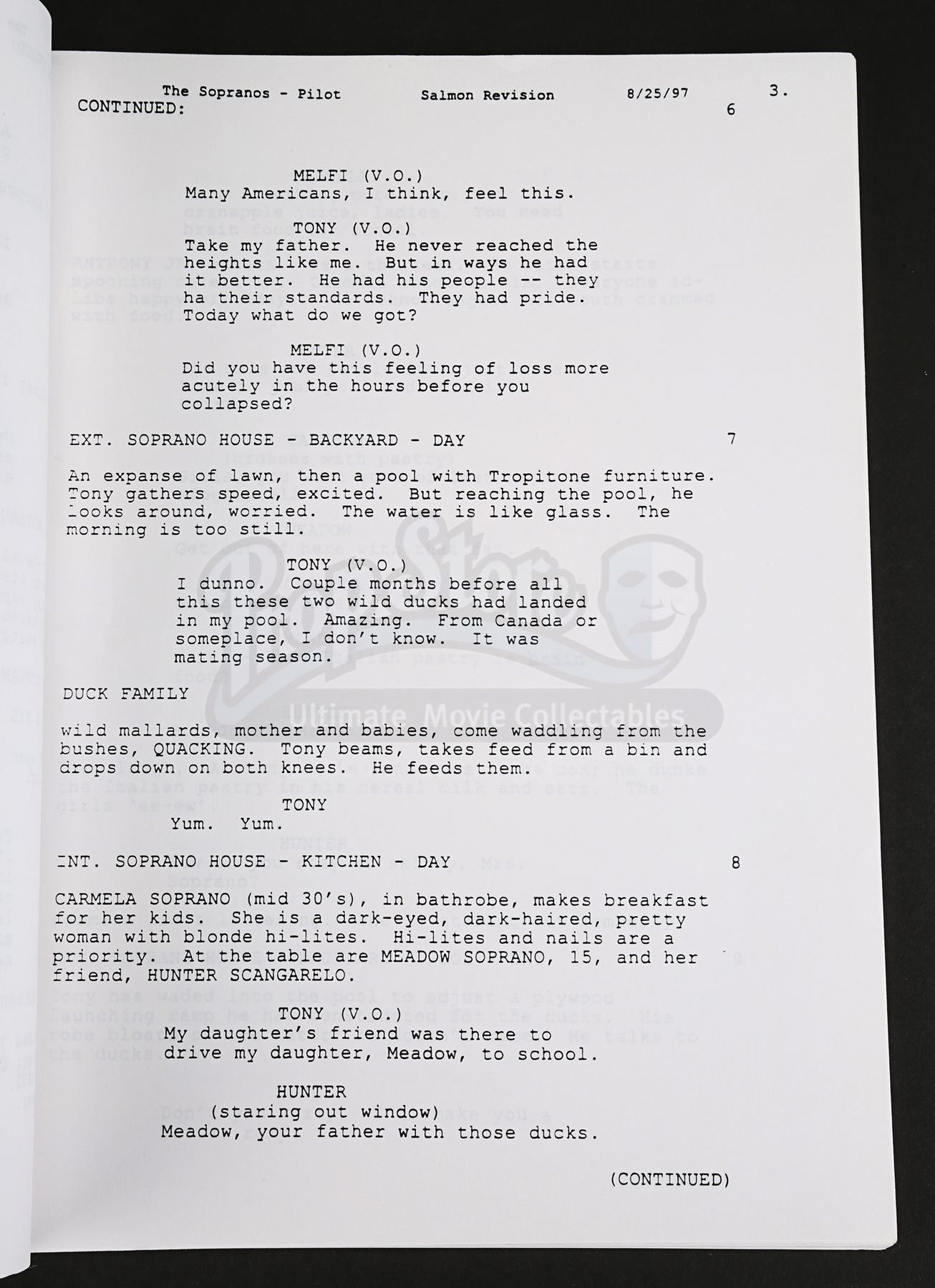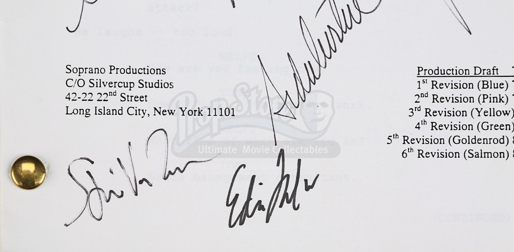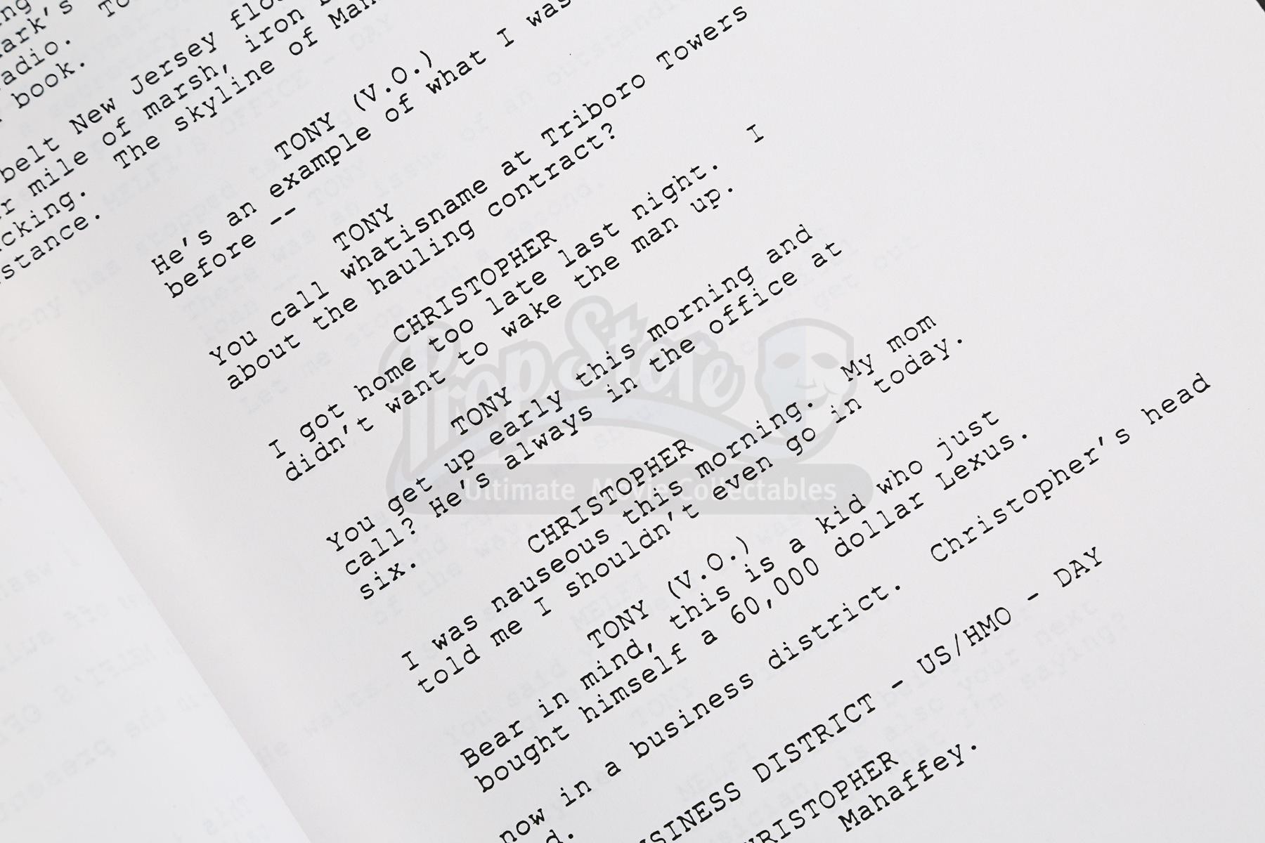 An autographed production-used script from gangster-drama television series The Sopranos. Written by David Chase, this salmon revision script for the pilot episode is dated 25 August 1997 and contains 65 U.S. Letter pages, bound together with three brass split pins.
