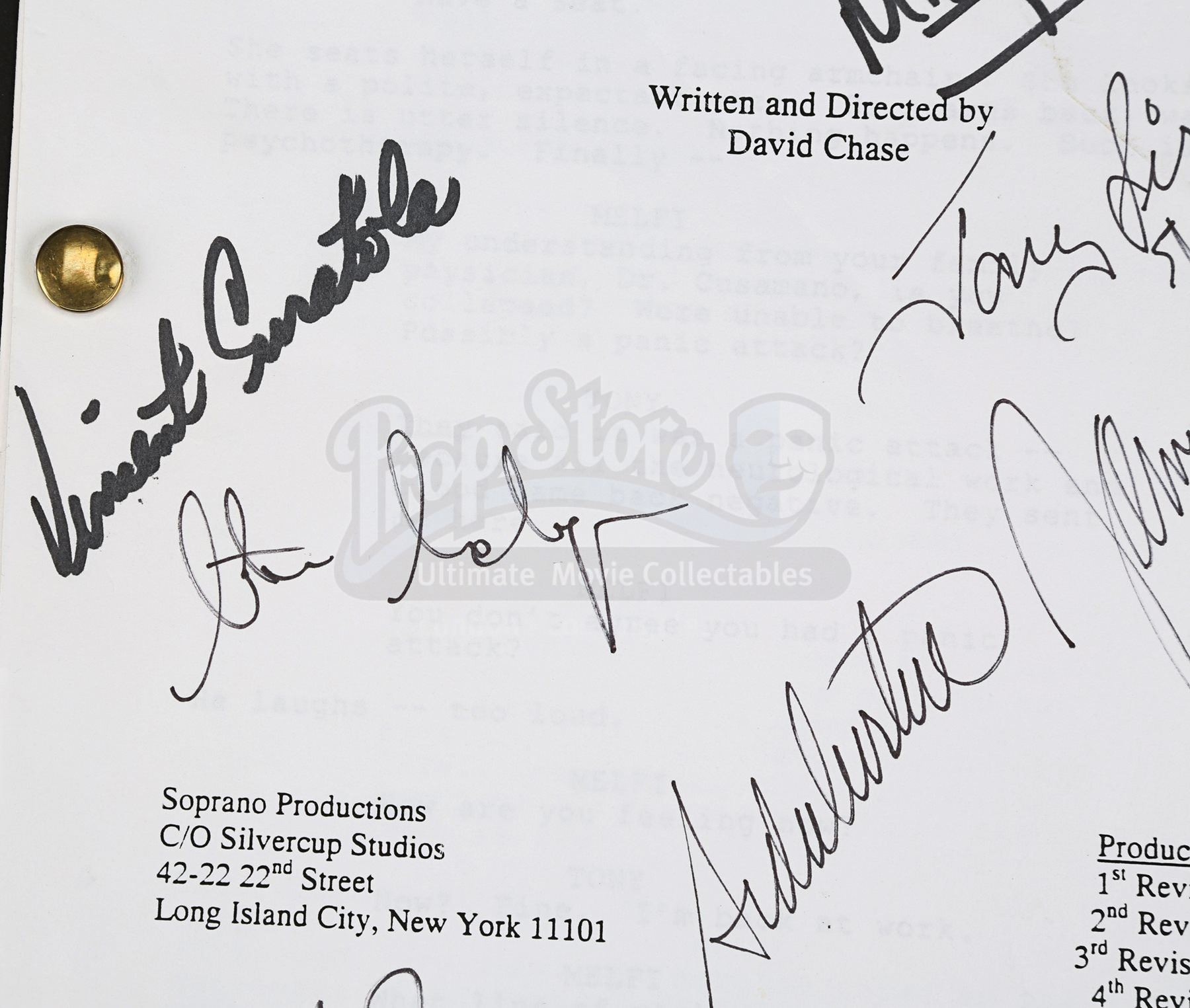 The unannotated script features a cover page displaying 11 main cast autographs, including James Gandolfini, Lorraine Bracco, Edie Falco and Michael Imperioli — in various black inks. Lightly used, the script shows very minor corner creases from production use. Dimensions: 28 cm x 22 cm x 1.5 cm (11” x 9” x ½”)