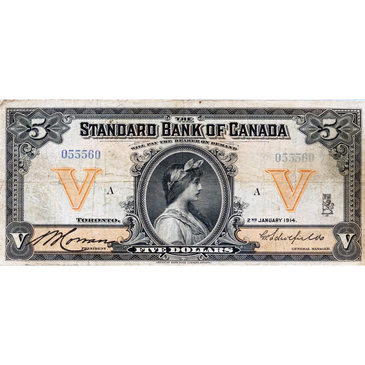 THE STANDARD BANK OF CANADA. $5.00. Jan. 2, 1914. CH-695-18-02. No. 055560/A. PMG Fine-15. Small internal tear.