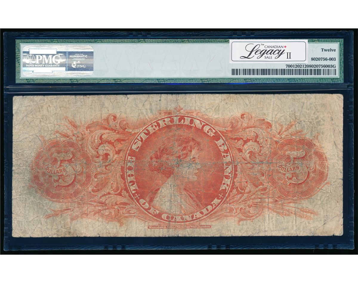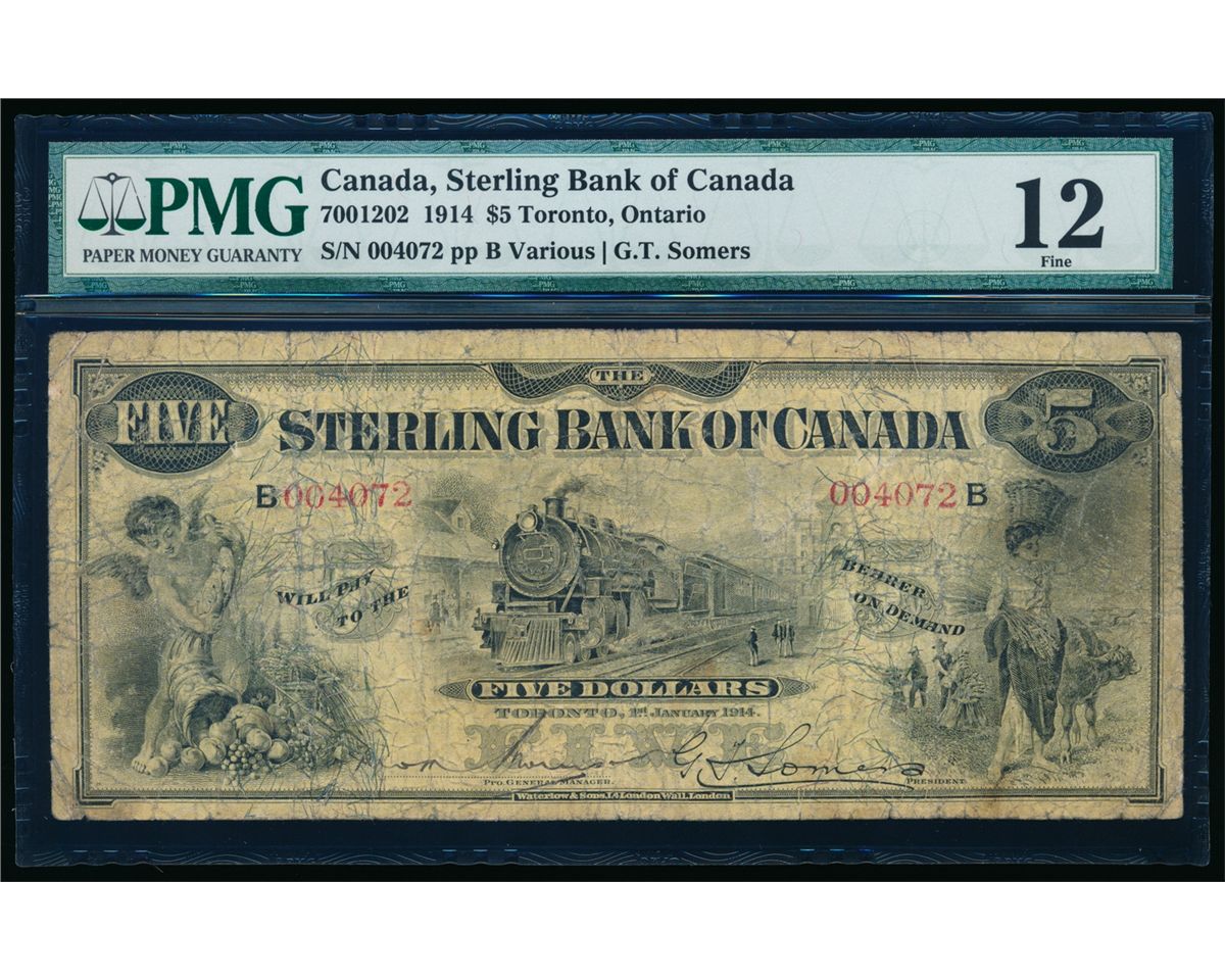 THE STERLING BANK OF CANADA. $5.00. 1st January 1914. CH-700-40-72. ms. various-Somers. No.004072/B. PMG graded Fine-12. From the Rosedale Collection.