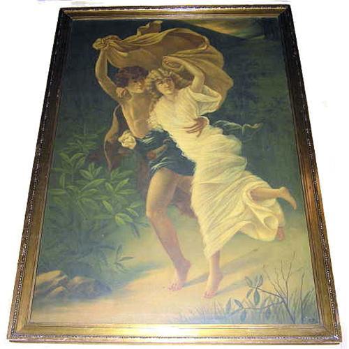 This is an exceptional oil on canvas copy of The Storm by PIERRE-AUGUSTE COT (1837-1883), dating from the early 20th century. Initialed " GD " by the artist in the lower right corner, along with a word or date which cannot be deciphered. Period giltwood frame measures 60.6" high, 42.8" wide and 1.5" deep.