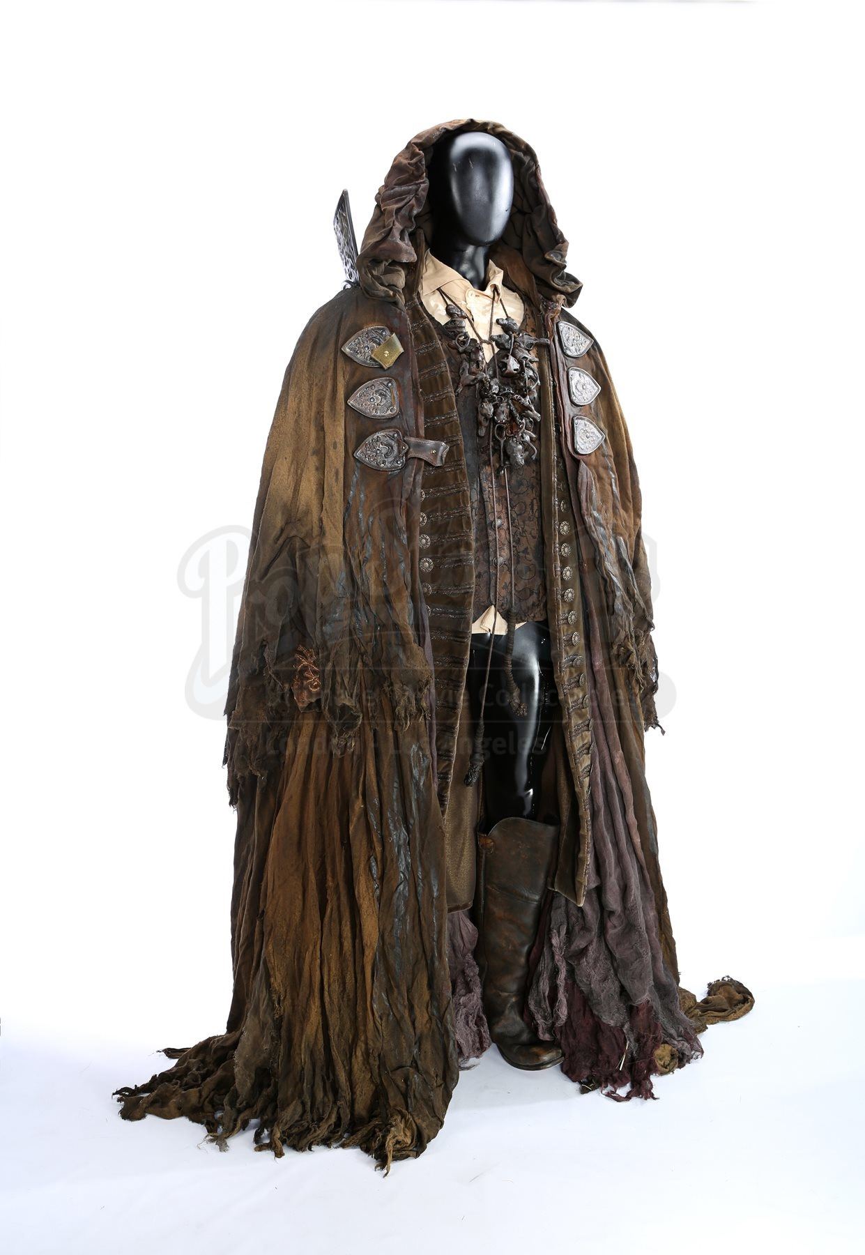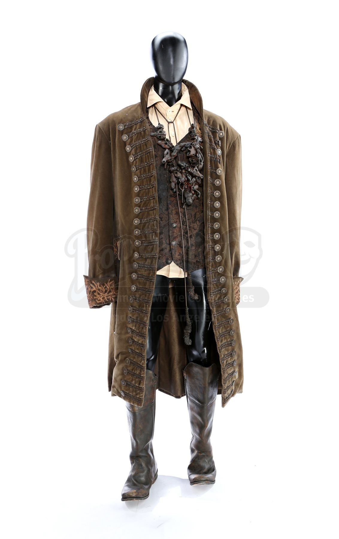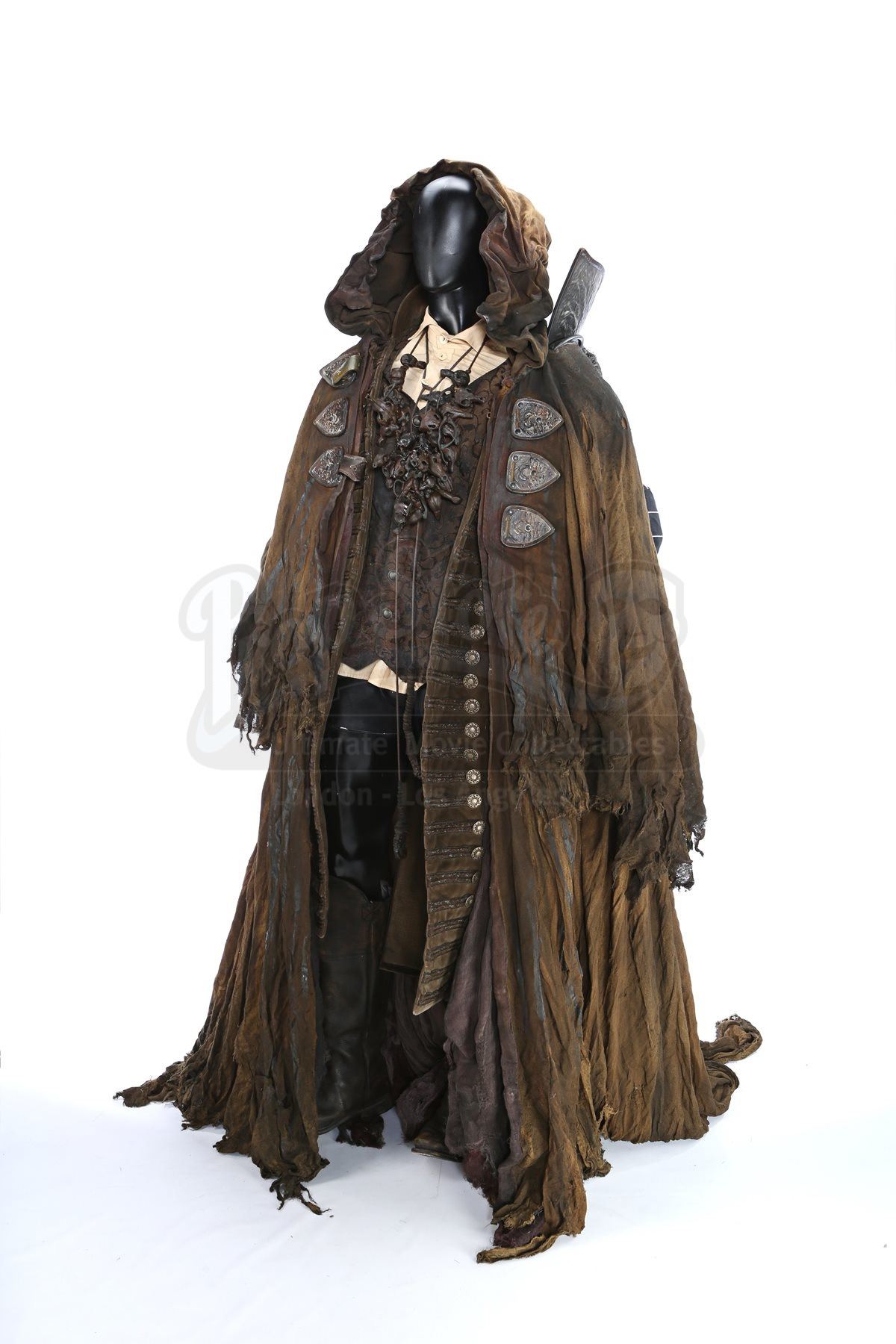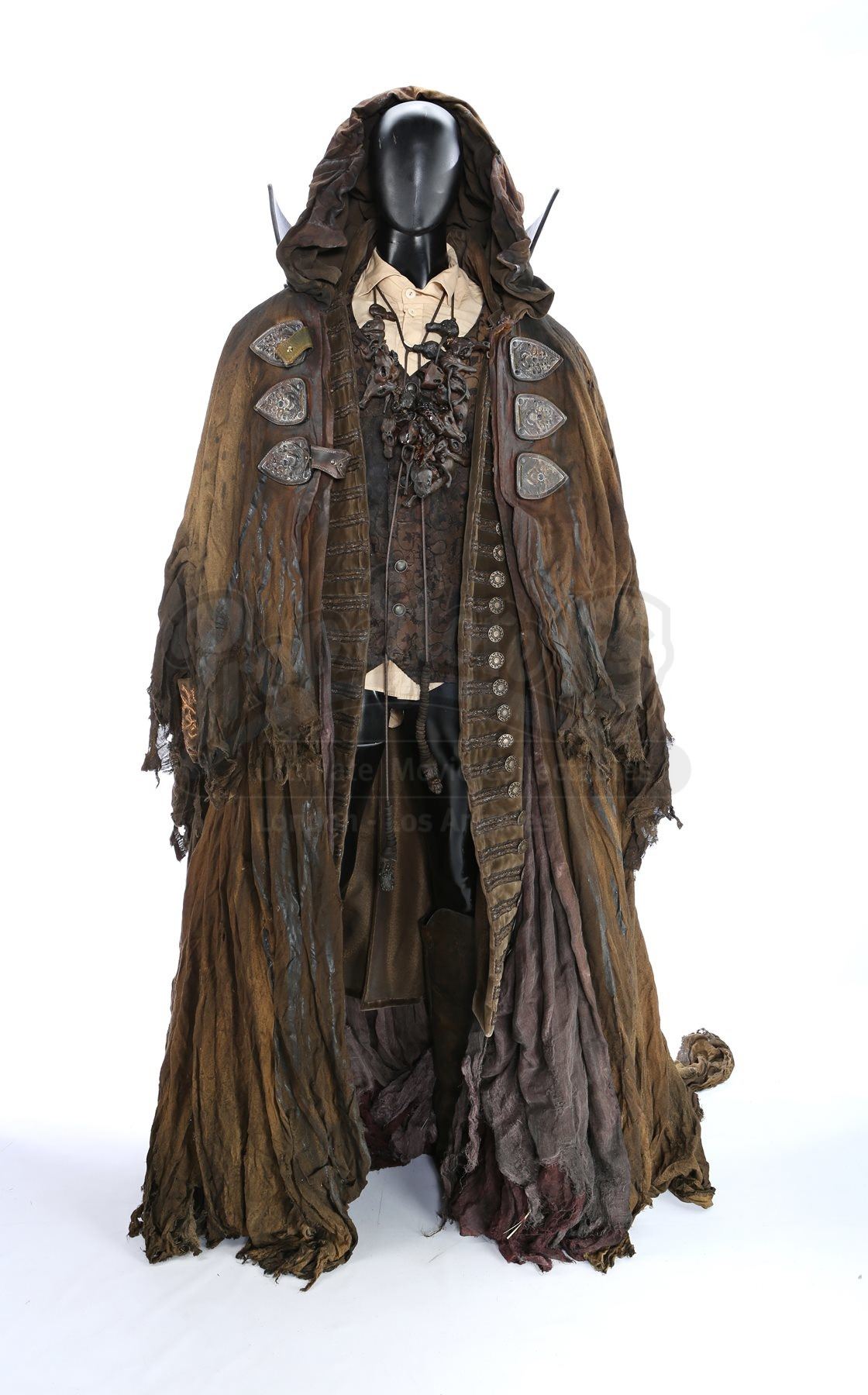 This imposing costume was designed by Academy Award®-winning costume designer Luis Sequeira, and consists of a large cloak, an undercoat, a vest, a tunic and a pair of boots. The large cloak is made of hand-dyed and shredded fabrics that are designed to make it look tattered and worn, with thick ropes also hanging from it. The necklace is produced from resin pieces cast in the shape of small pieces of bone, painted and coated in certain places with dried blood. Attached to the necklace is a tag marked, “Young Master”. A shirt, worn under the vest, and an ornate velvet undercoat complete the costume. Each boot is a size 11.5 (US) and is made from leather, and each garment is marked as being a stunt piece. The costume shows intentional signs of wear and is in very fine condition.
